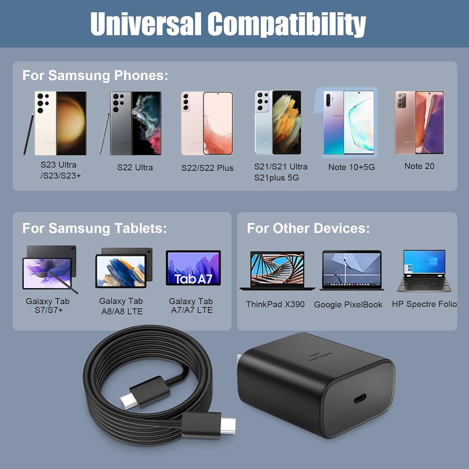 - 【45W Samsung Charger Fast Charging Compatibility】45W Samsung phone charger super fast charging for Samsung Galaxy S23 Ultra, S23, S23+, Galaxy S22 Ultra, S22, S22+, S21 Ultra/ S21/ 21+/ S20 Ultra,Galaxy S20/ S20+/ S20 FE, Note 20/ 20+/ 10+/ 10+ 5G/ S10 5G, Note 10/ 9/ 8,Galaxy Tab S7/S7+/S8/S8+/S8 Ultra,Z Fold 4/ Z Flip 4, Galaxy A91, Galaxy Z Fold 3 5G, Pixel 5 / Pixel 4xl, other USB C devices and more future compatible devices.