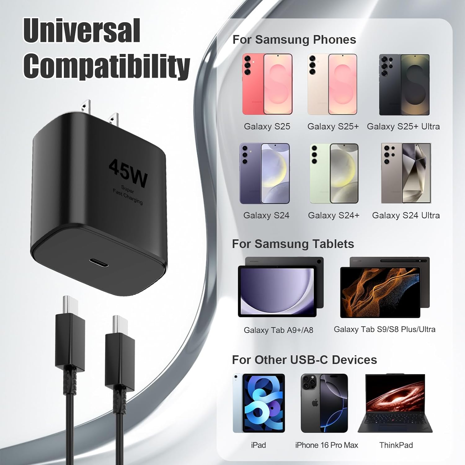 | For Samsung Galaxy Devices | Samsung Galaxy S25/S25 Ultra/S25 Plus /S24/S24 Ultra/S24 Plus /S23/S23 Ultra/S23 Plus /S22/S22 Plus /S22 Ultra 5G /S21/S21+ /S21 Ultra 5G /S20/ S20+/ S20 Ultra/ S20 FE 5G / Note 20/ Note 20 Ultra 5G/ Note 10/ 10+/ Z Fold 4/Fold 3/Z Fold 2/ Z Flip 4/Z Flip 3/Z Flip/ S10/ S10 plus/S10e/S9/S9 Plus/S8/S8 Plus and more Samsung Galaxy Tab S7/S7+/S7 FE/S8/S8 Plus/S8 Ultra/ A53/A73/A33 /A90/ A80/ A72/A71/ A70/A60/A52/A51/ A42/A5/A3 and other A series |