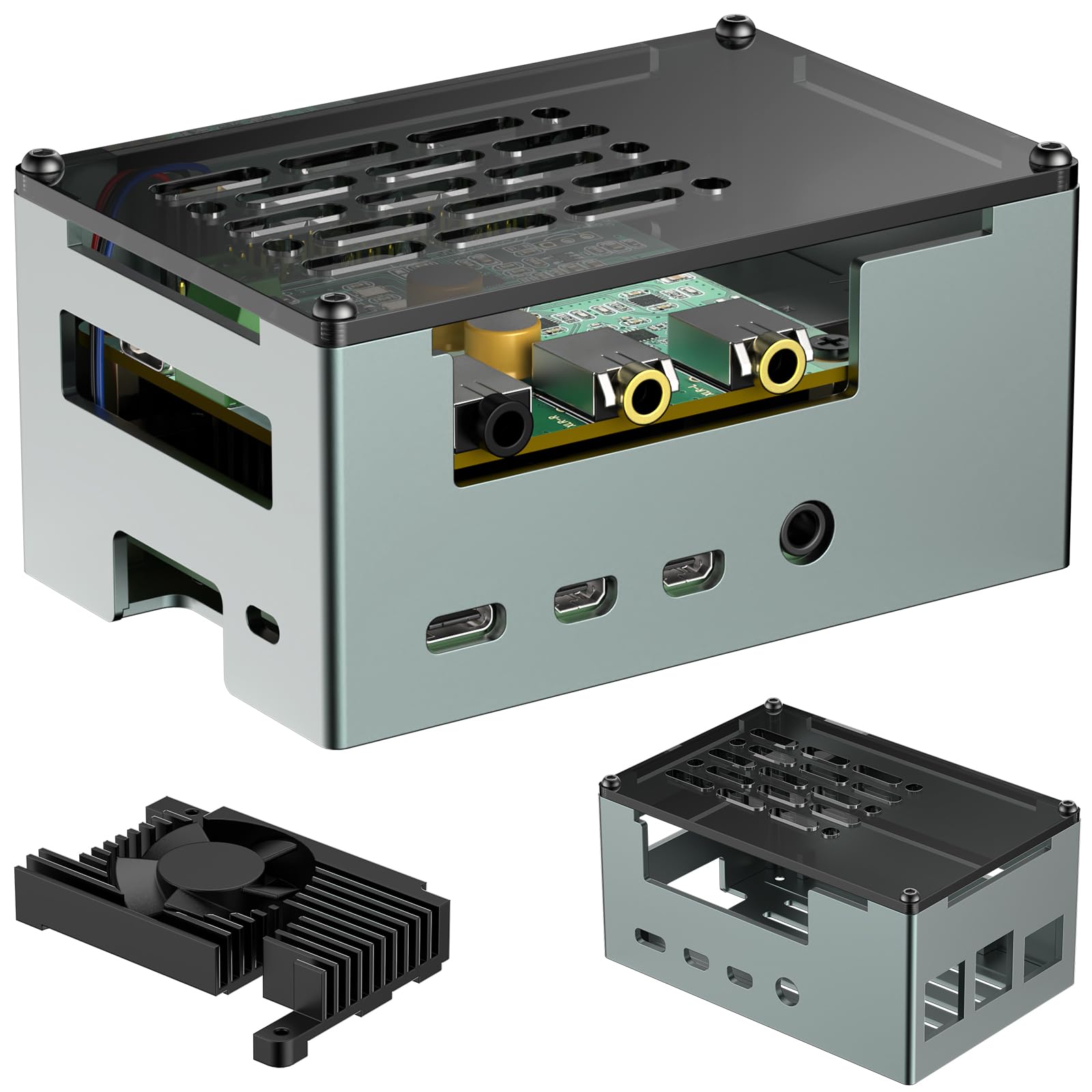 Aluminum Alloy Case for Raspberry Pi 4 – Compatible with DAC/DAC PRO/AMP/AMP PRO/RS485&CAN HAT, 3510 PWM Fan & Passive Heatsink Cooling for Expanded Boards