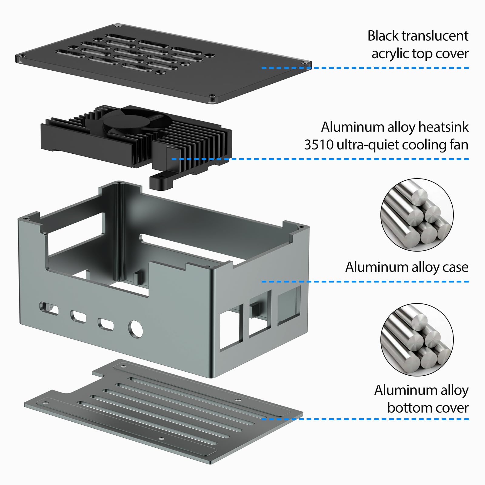 - Raspberry Pi 4 Case with advanced cooling: integrates a 3510 PWM ultra-quiet fan and a large passive heatsink for superior heat dissipation, ensuring stable performance under heavy computational loads or continuous operation.