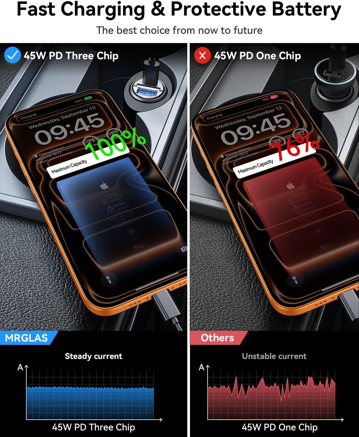 - OFFICIALLY APPROVED CHIP, AIM FOR FASTER & SAFER: MRGLAS fast car charger adapter Built-in PD45W&QC45W dual-core intelligent identification chip outputs 45W of fast charging current in each of its two cores, And the latest security control chip, which is a safe and high-speed Fast Car Charger without damaging the device