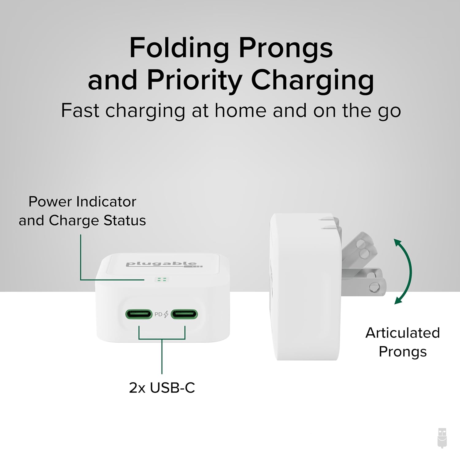 Plugable Dual USB C Charger Block, 40W Foldable 2-Port Fast Charging Flat USB C Wall Charger, Power Delivery for iPhone 16, iPad, AirPods, Samsung Galaxy, Pixel (PS-40C2W) White