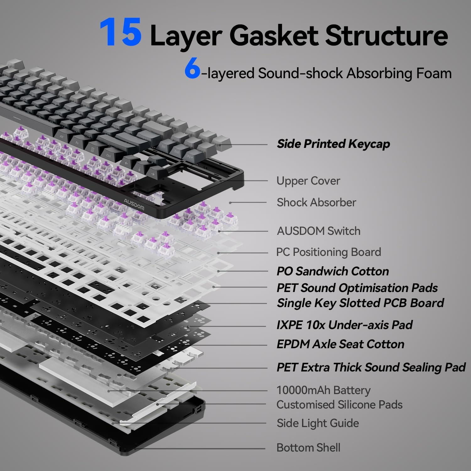- 15 Layers Gasket Structure & PCB Single Key Slot: This 75% TKL bluetooth keyboard adopts a gasket construction and PCB single key slot to optimize resilience and stability, making the hand feel softer and more elastic. With a 6-layer filling muffler design—1 layer more than other mechanical keyboards-effectively counteracts 95% cavity noise from switches hitting the positioning plate, ensuring a quieter and more solid typing experience.
