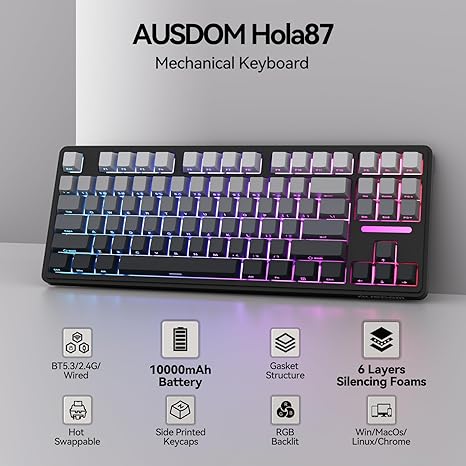 - Tri-Mode Connectivity & Multi-Device Support: The Hola 87 Wireless Mechanical Keyboard offers BT5.3/2.4GHz/USB-C wired options, easily adapting to your needs. Seamlessly connect up to 5 devices (desktops, laptops, tablets, and more) simultaneously and switch between them using shortcut keys (FN+1/2/3 for Bluetooth, FN+4 for 2.4G, FN+5 for wired), making it a versatile and cost-effective solution for multitaskers.