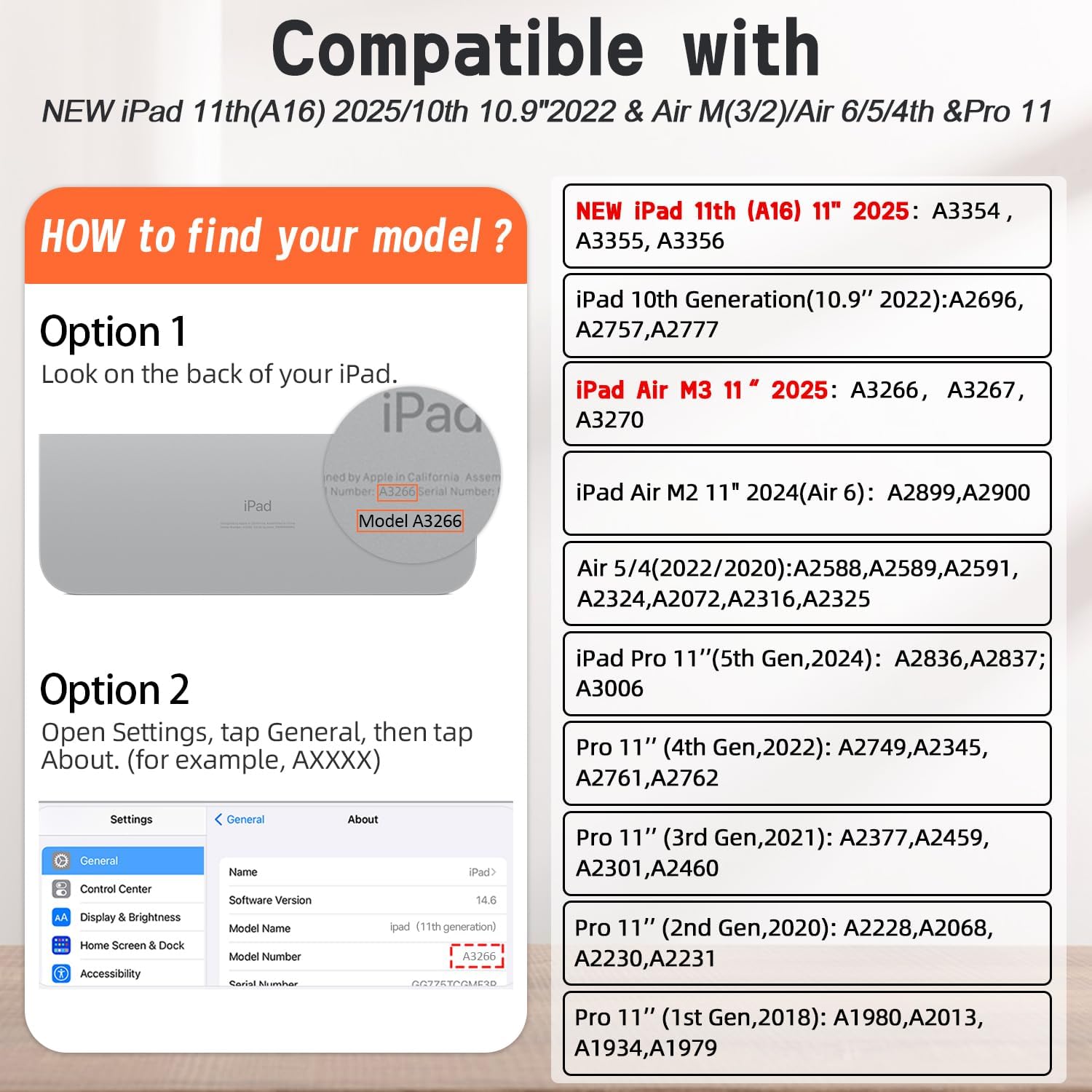 • ❥【Compatible with】: Compatible with New iPad 11th (A16) 11 in 2025 (Model Number:A3354 A3355 A3356)/10th Generation-10.9″ 2022 (Model Number: A2696 A2757 A2777); iPad Air 11-M3 (Model Number:A3266 A3267 A3270); iPad Air 6(M2)-11″ 2024(Model Number: A2902 A2903 A2904); iPad Air 4/5-10.9” 2020/2022 (Model Number:A2588 A2589 A2591 A2324 A2072 A2316 A2325) iPad Pro 11″ 5th/4th/3rd/2nd/1st Gen-2024/2022/2021/2020/2018 (Model Number:A1980 A2013 A1934 A1979 A2228 A2068 A2230 A2231 A2301 A2377 A2459 A2460 A2435 A2759 A2761 A2762 A2836 A2837 A3006). Not compatible with any other model. You can refer to the code next to the Apple logo on the back of your tablet. Thank you.