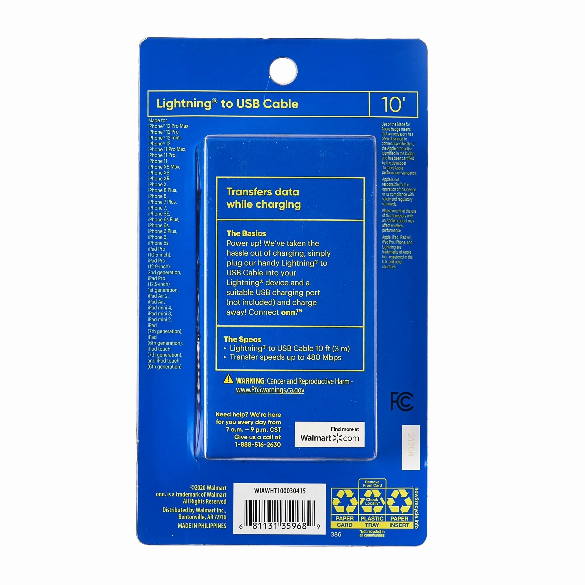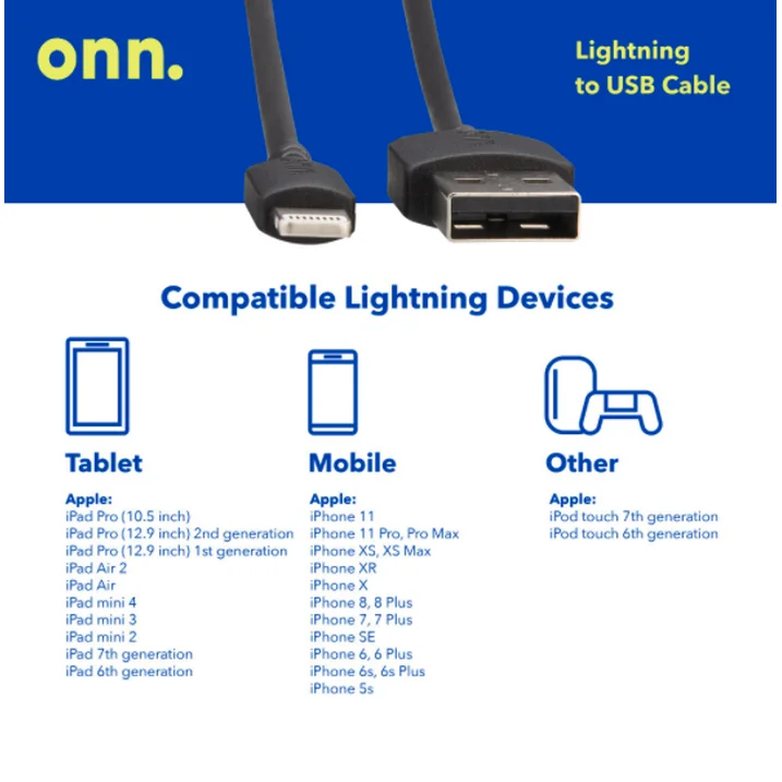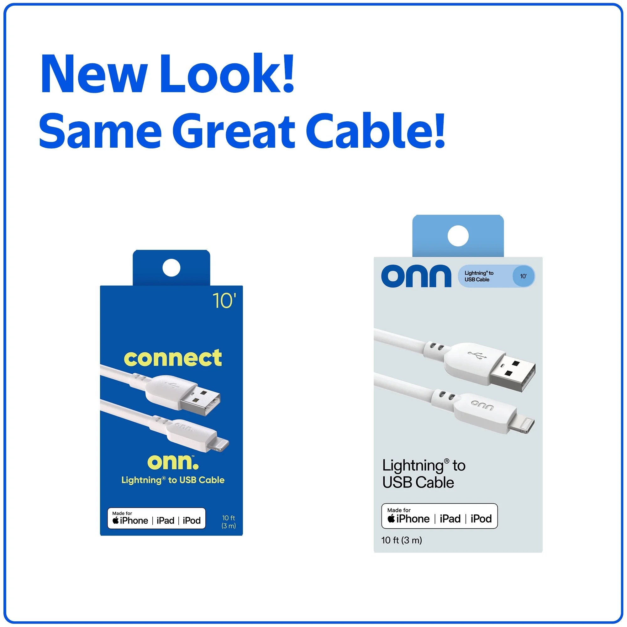 - onn Lightning to USB 10ft Charging Cable, MFI Certified, White, Compatible with iPhone 14/13/12/11/X/XR/XS/8/7/6/5, iPad, AirPods and more