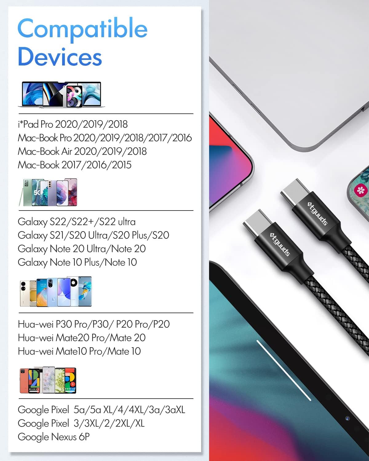 • Universal Compatibility: etguuds usbc to usbc cable is compatible for iPhone 17 16 15, for MacBook, for iPad, for Samsung Galaxy S25 S25+ S25 Ultra S24 S24+ S24 Ultra S23 S22 S21 S20 A54 A53 A15 A14 Note 20 10 Z Flip/Fold 6 5 4 3, for Pixel 9 8 7 6 5