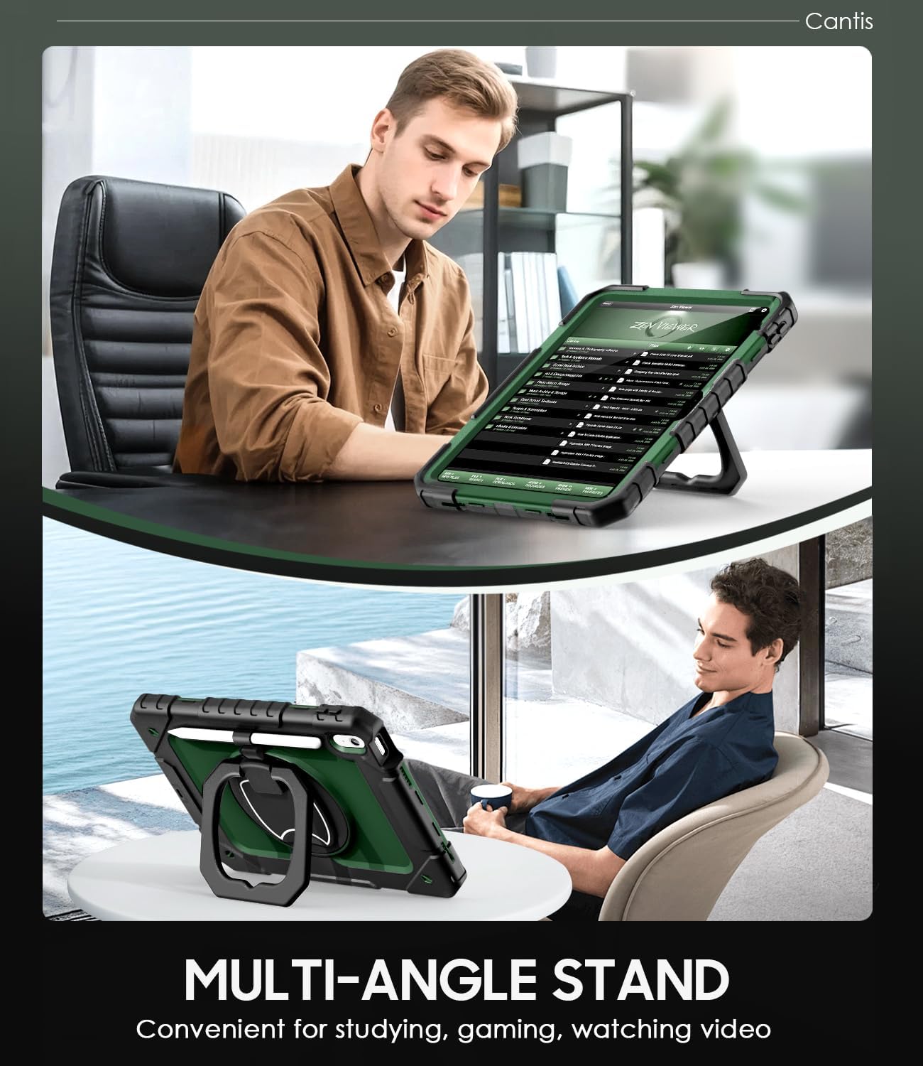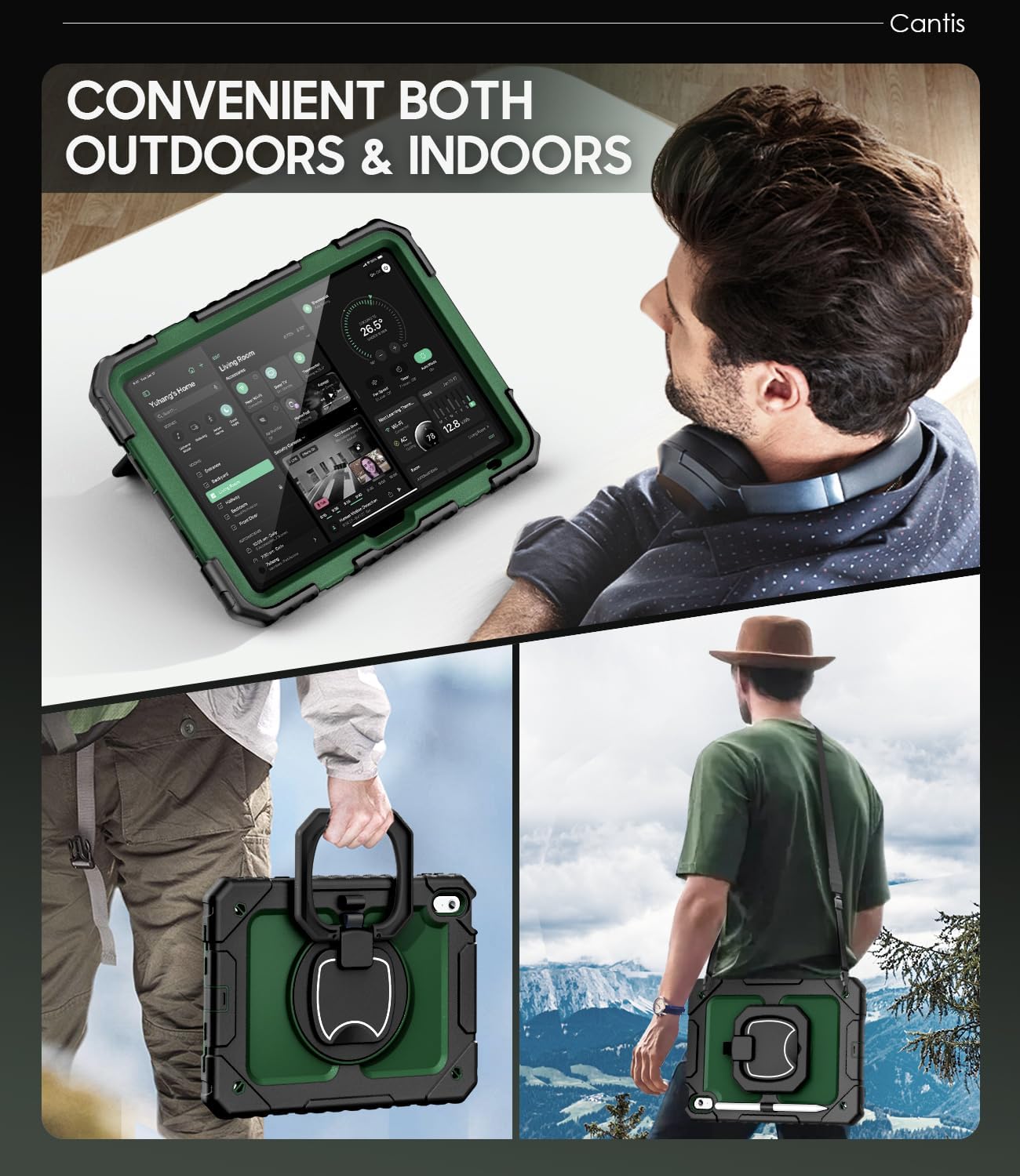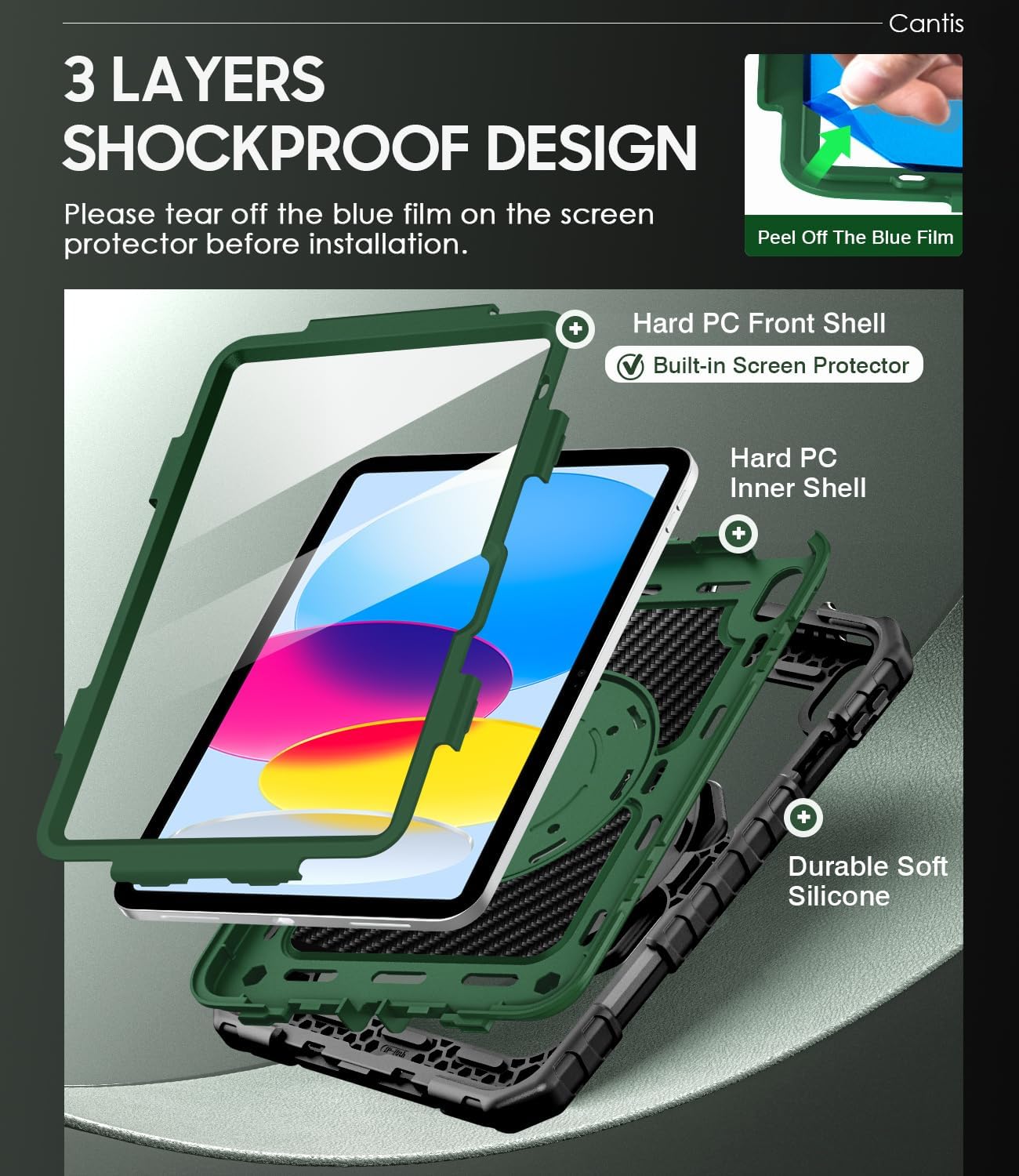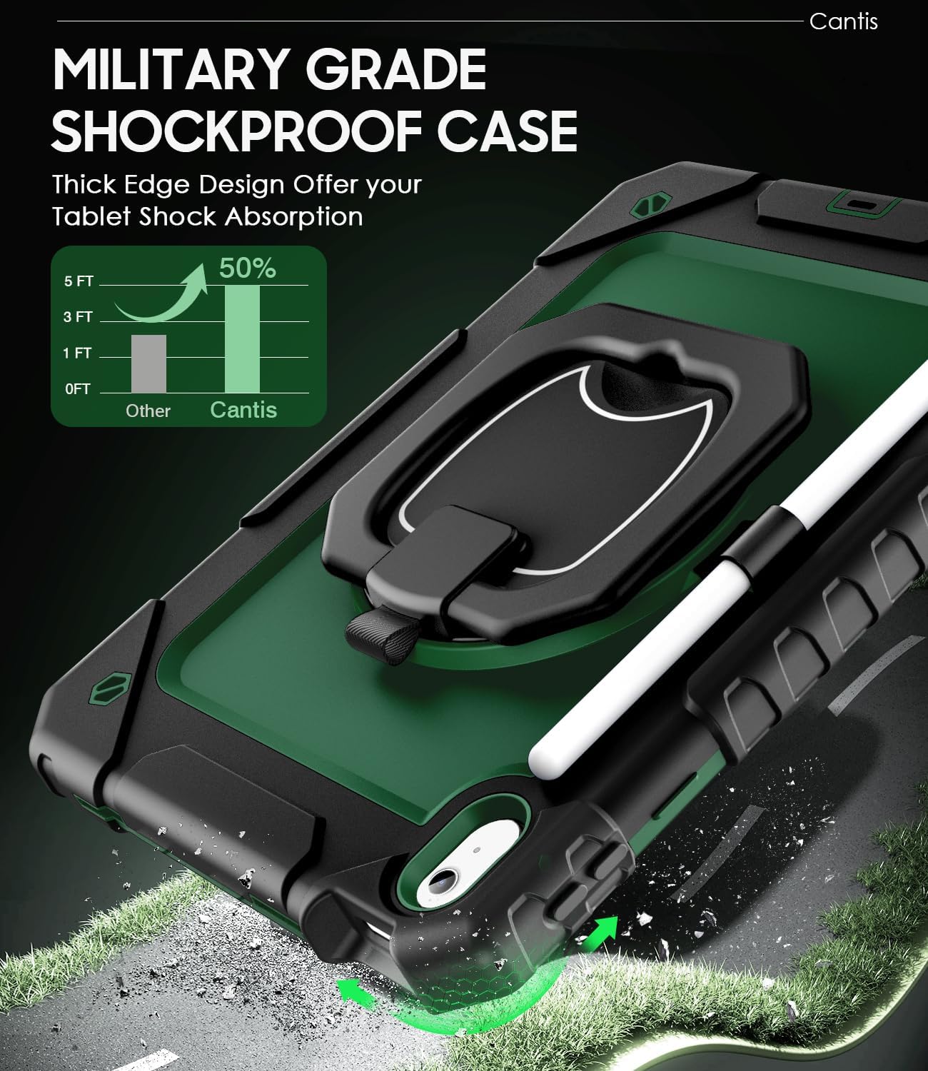 Cantis Case for iPad (A16) 11th/ 10th Generation 11/ 10.9 Inch 2025/ 2022, Shockproof Case for iPad 11 with Screen Protector/ Rotating Stand/ Adjustable Shoulder Strap/ Pen Holder, Black+Alpine Green