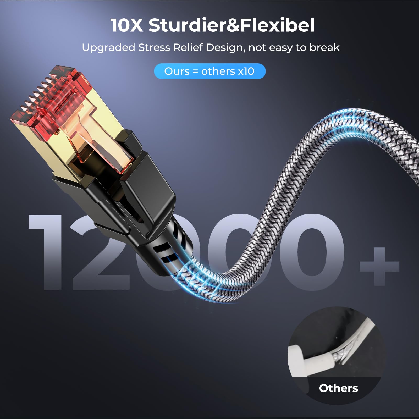 - Unique braided design: The outer layer of our internet cable is made up of 48-strand cotton yarn braid, which is stronger and sturdier than regular nylon braid.Tested with more than 12,000 bends, our wire is tangle-free, corrosion-resistant, and can be buried directly into the ground for heavy-duty work.Works effectively in cold, wet and hot weather