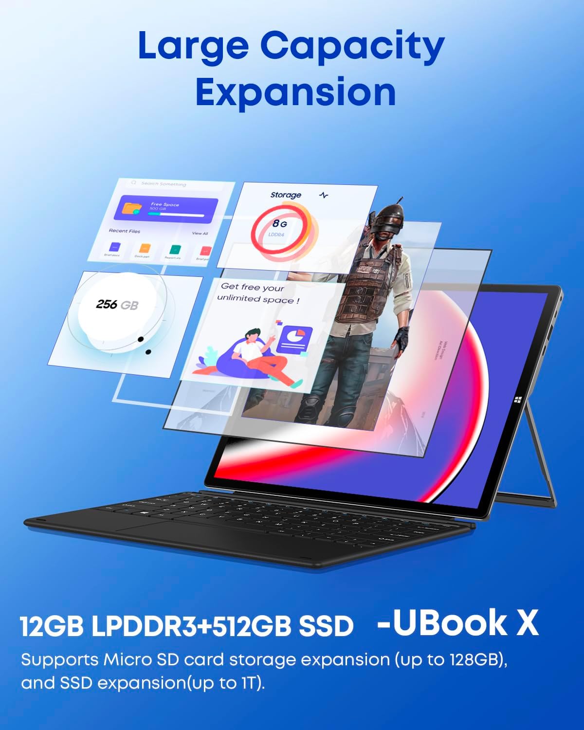 - 【12GB + 512 GB Large Storage】Save more photos, videos, and documents, and run multiple games with ease by using the big storage of 12GB LPDDR3 and 512GB SSD (5 times faster than the original eMMC storage). This Windows tablet supports Micro SD card (not included) storage expansion of up to 128GB, support SSD expansion of up to 1T. You can take many favorite media files, such as e-books, videos, photos, music, etc. with you.