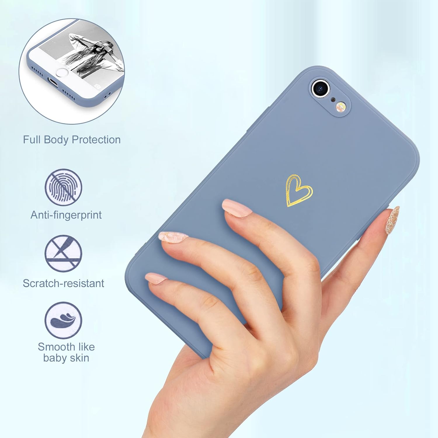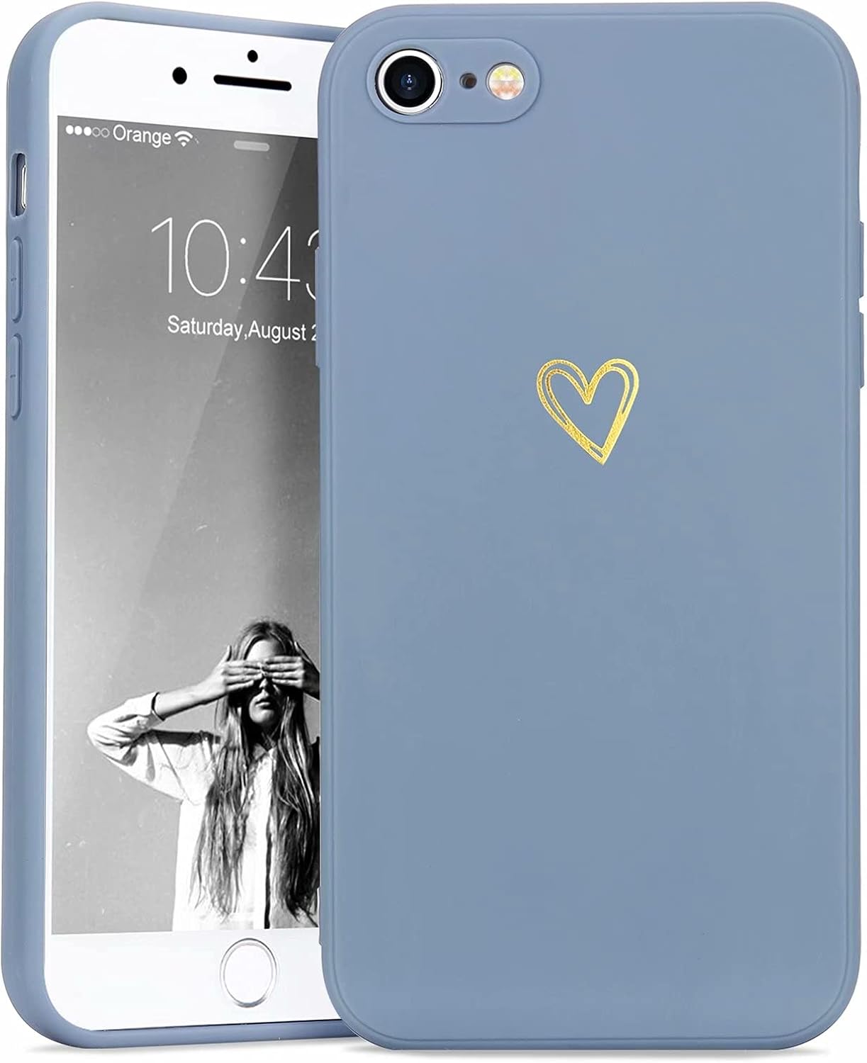 iPhone SE Case 2022/2020, iPhone 8 iPhone 7 Case for Women Girls Silky Soft Protective Shockproof Silicone Phone Case with Cute Heart Design, Blue Grey