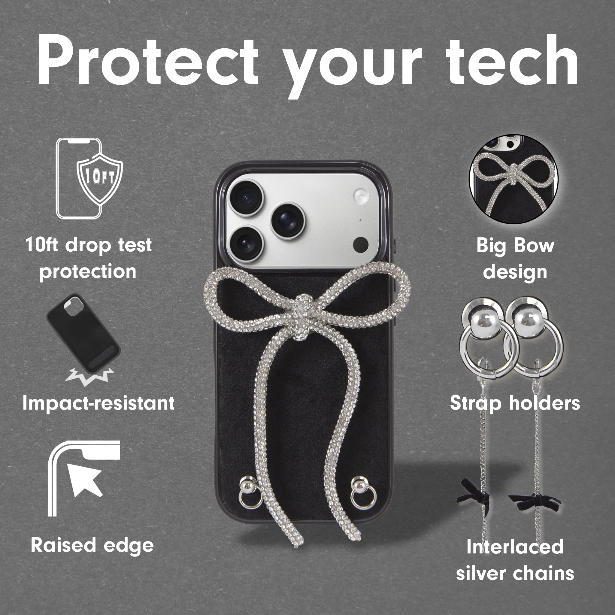 Crossbody Case for iPhone 17 Pro Max – Black with Stylish Silver Detachable Chain – Big Bow
