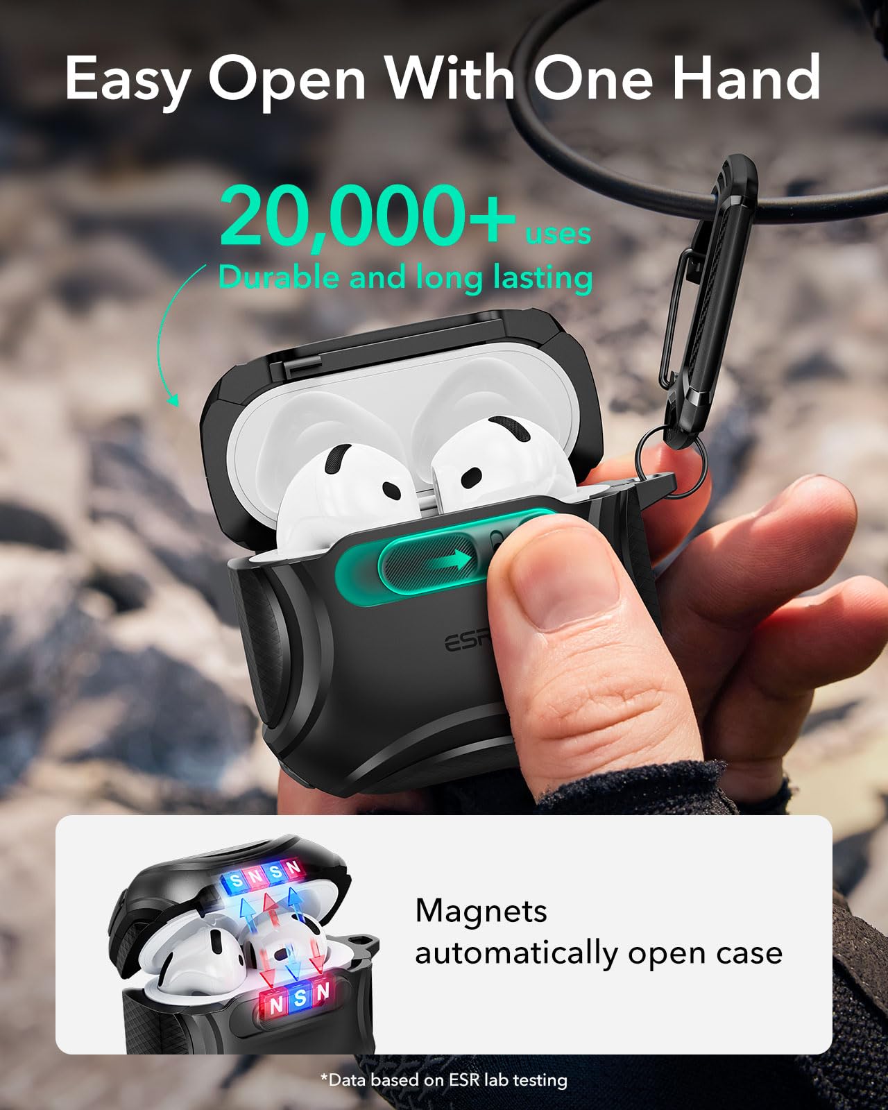 - Slide to Open: slide the latch on the front to shift the magnets and spring the lid open, allowing instant access to your earbuds with just one hand