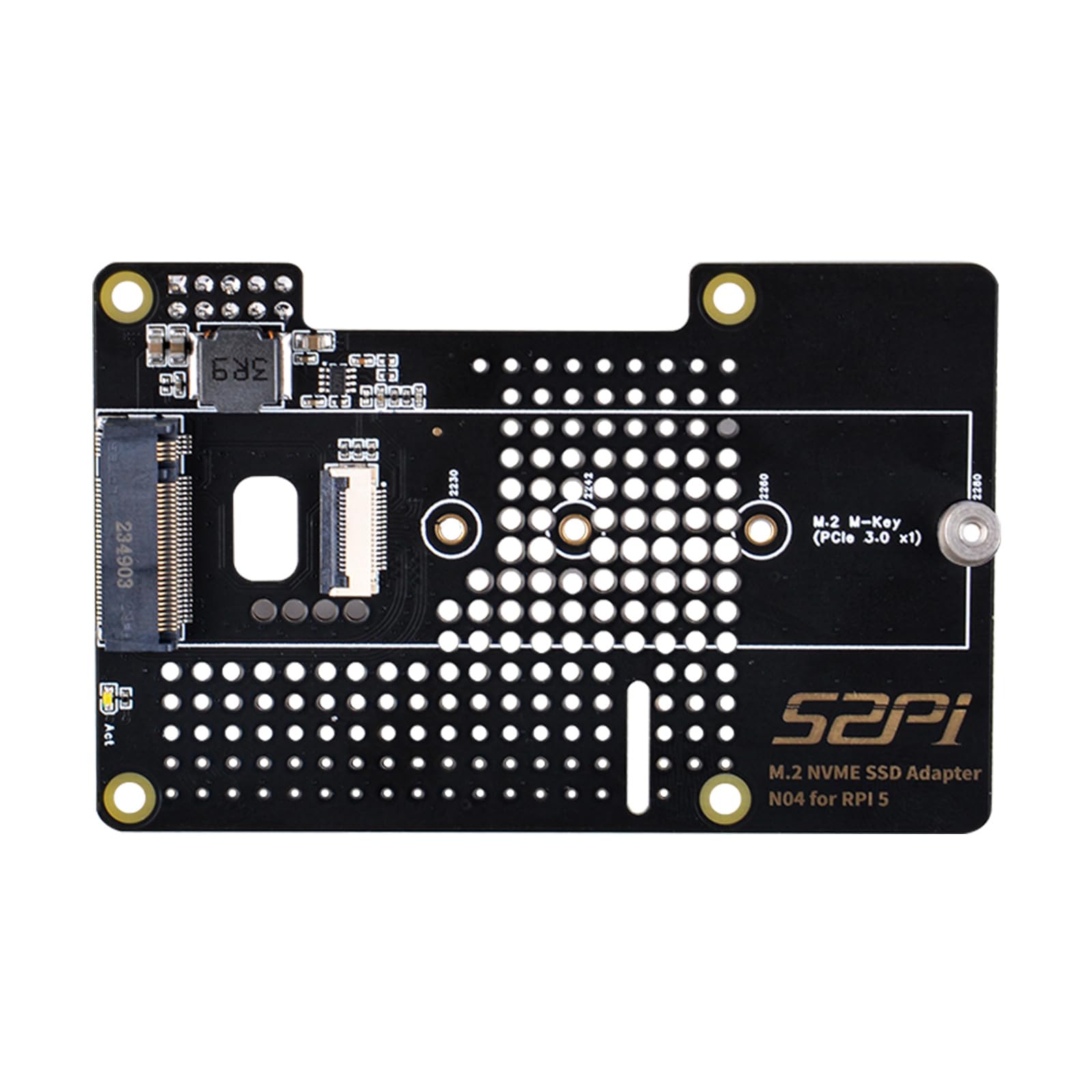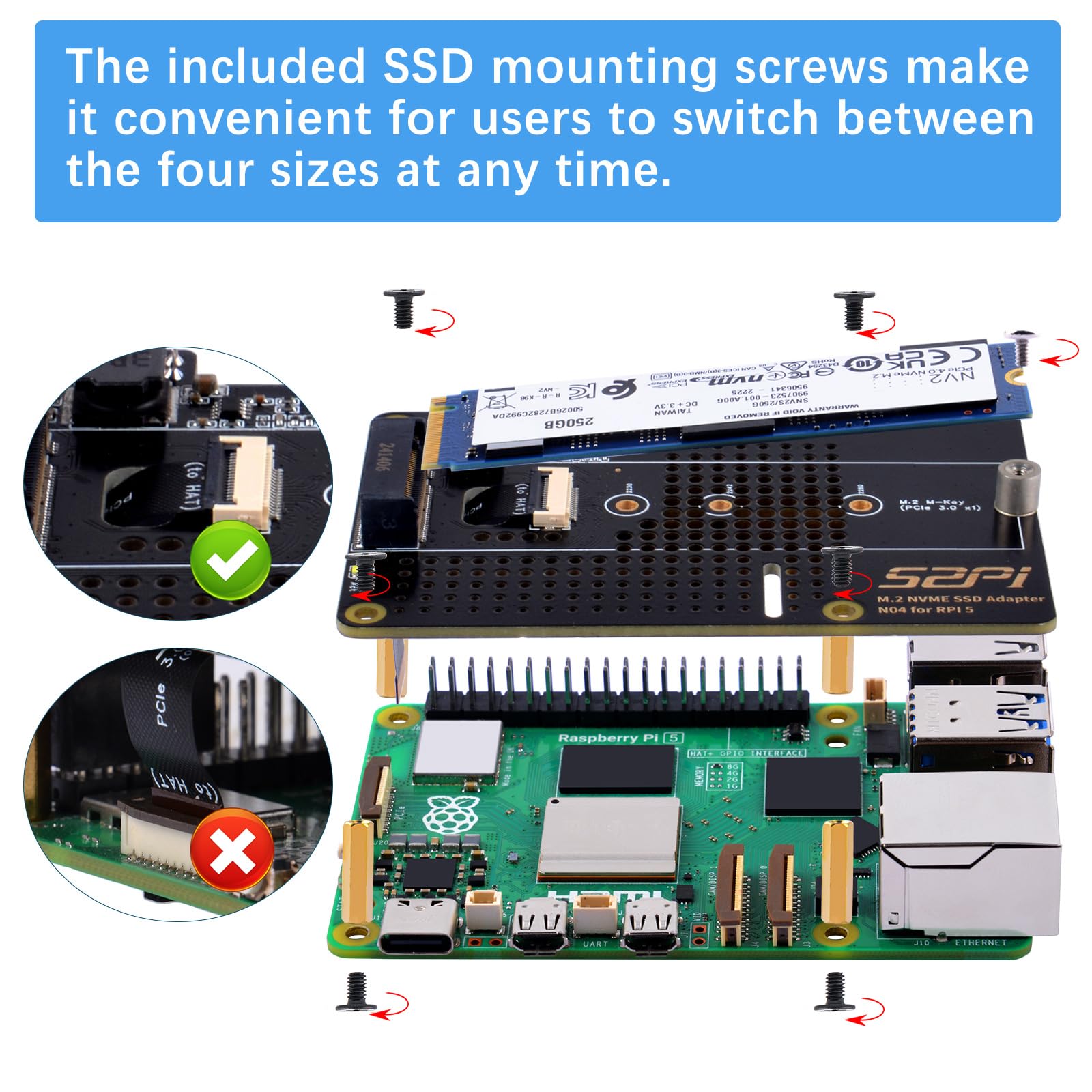 • N04 M.2 NVMe to PCIe Adapter is designed for Raspberry Pi 5. It supports the installation of NVMe (M-key) drives in M.2 format sizes 2230, 2242, 2260 and 2280. Extra custom CNC SSD mount screw, no soldering required.