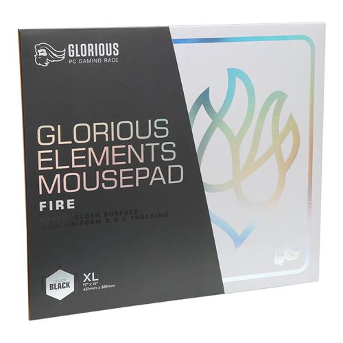 The Glorious Elements XL Gaming Mouse Pad in Fire design features a smooth surface and ample space, ideal for immersive gaming experiences.