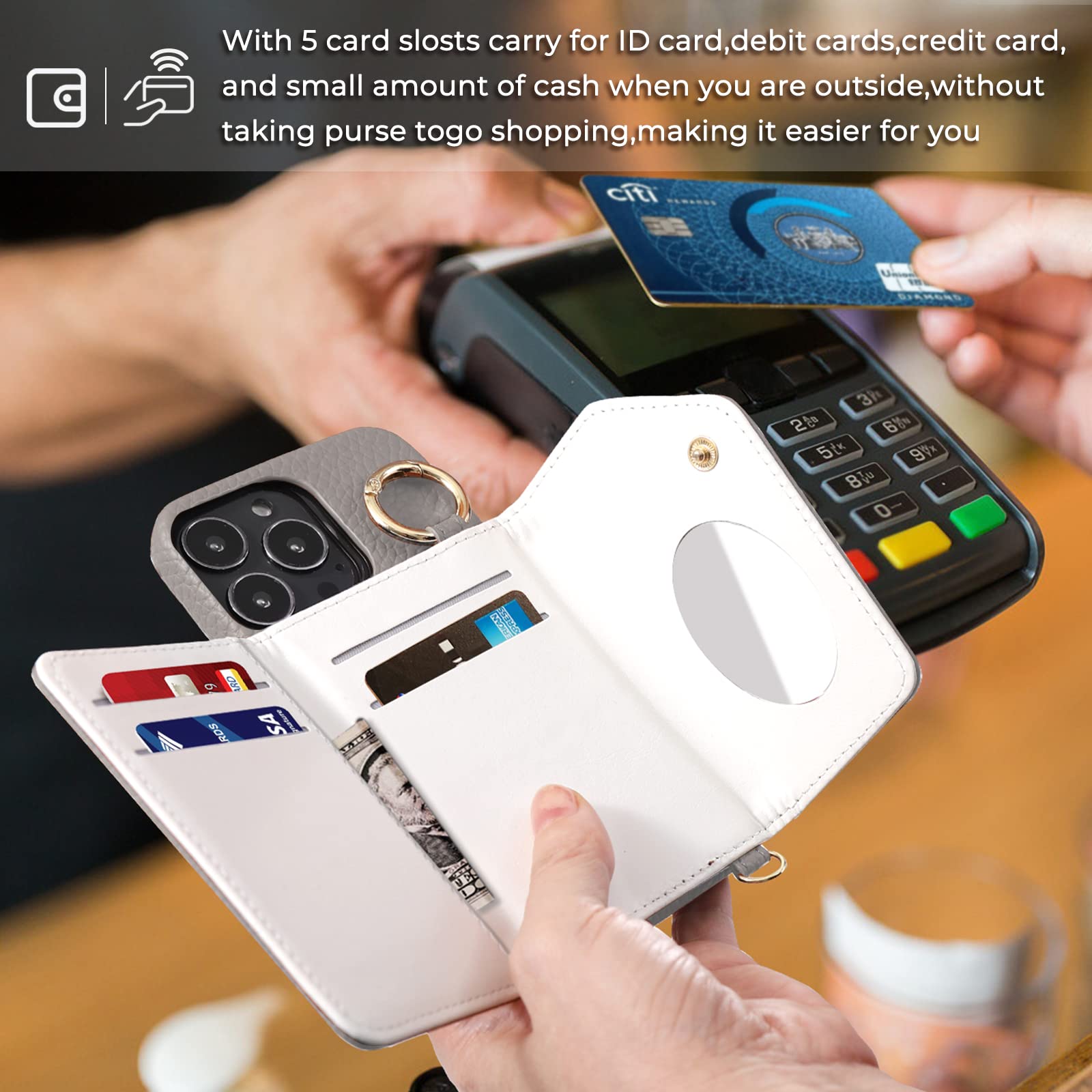 With 5 card slosts carry for ID card,debit cards,credit card,and small amount of cash when you are outside,Get rid of your Big& Heavy handbag!