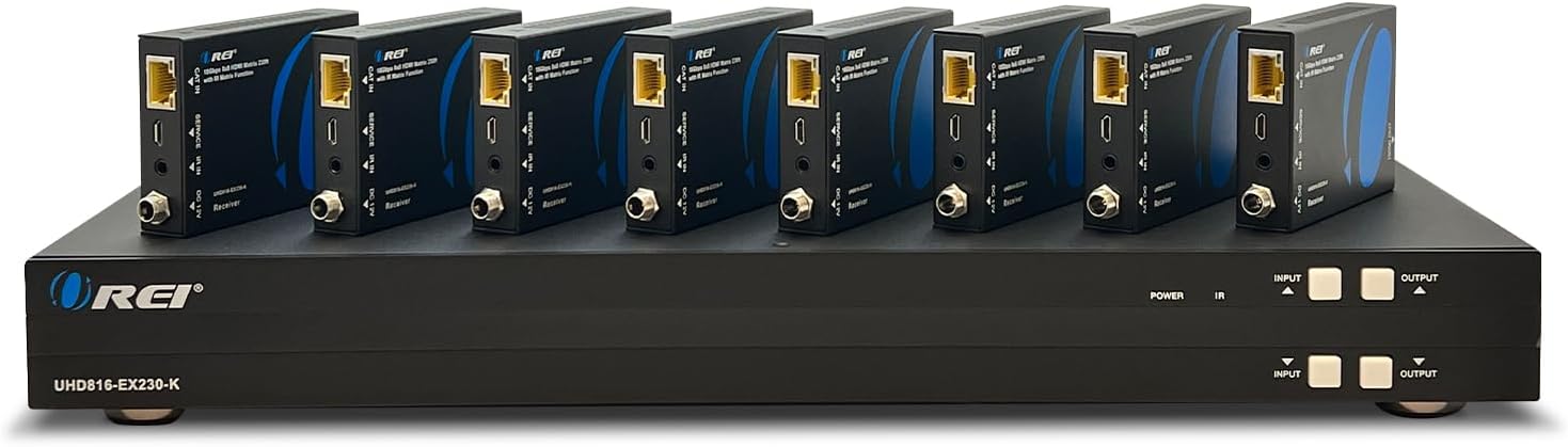 OREI 4K 8×8 HDMI Extender Matrix – UltraHD 4K @ 60Hz 4:4:4 Over Single CAT5e/6/7 Cable with HDR Switcher & IR Control, RS-232 – Up to 230 Ft – 8 x Loop Out – 8 Receivers Included