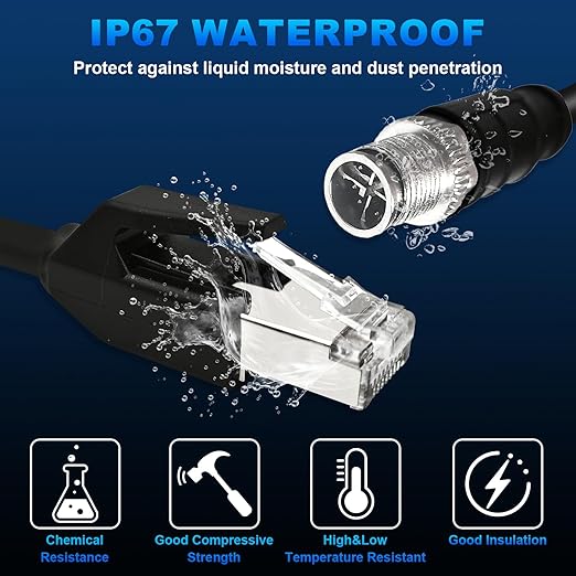 - IP67 Waterproof for Harsh Environments; Designed specifically for industrial applications, this M12 to RJ45 Ethernet cable features an IP67 waterproof rating; It prevents moisture and fine particles from penetrating the cable, making it ideal for use in harsh conditions and guaranteeing long-lasting performance across various industrial sectors