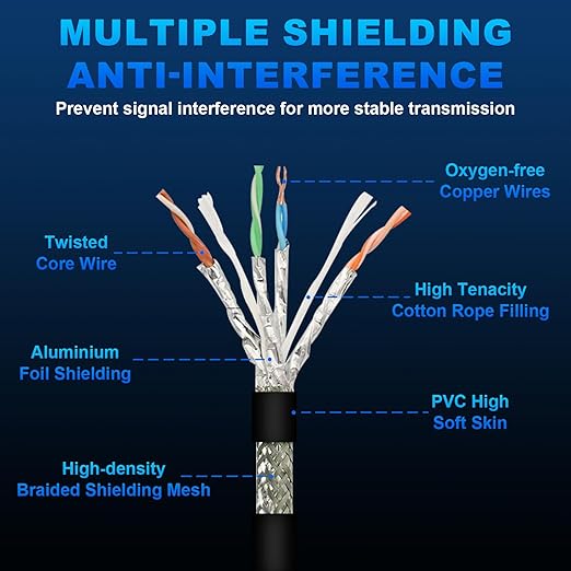- Sturdy and Highly Flexible PVC Cover; The outer layer of this Ethernet cable is made from flexible PVC material; It’s resistant to stretching, oil, wear, making it the perfect solution for demanding environments, while ensuring longevity and reliability