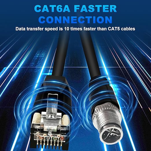 - Crafted with premium materials, this M12 X Code 8 Pin Male to RJ45 Ethernet CAT6A cable includes pure copper gold-plated contacts and a flexible 26 AWG wire wrapped in a robust PVC sheath; Its 360-degree omni-directional shielding provides superior protection against EMI interference, ensuring reliable data transmission; Cable Length; 3M/9.9FT