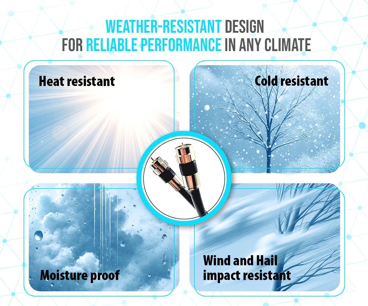 - ✅ Weatherproof Jacket – Indoor & Outdoor Use This coax cable is coated in a durable, moisture-resistant outer layer that withstands sunlight and harsh conditions, making it the perfect solution for both indoor walls and outdoor TV antenna cable extension installations.