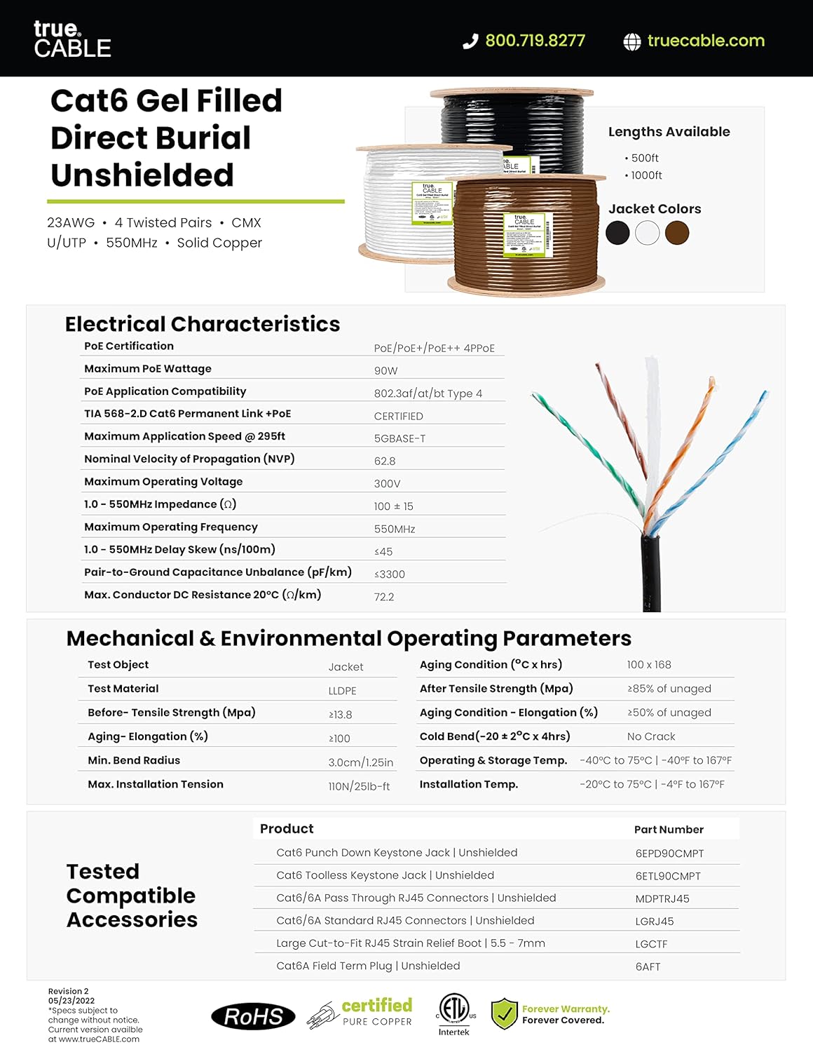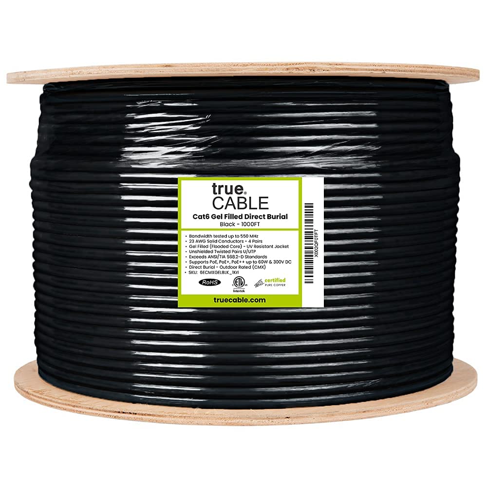 trueCABLE Cat6 Direct Burial, Gel Filled, 1000ft, Black, Waterproof, CMX, 23AWG Solid Bare Copper, 550MHz, PoE++ (4PPoE), ETL Listed, Unshielded UTP, Bulk Ethernet Cable
