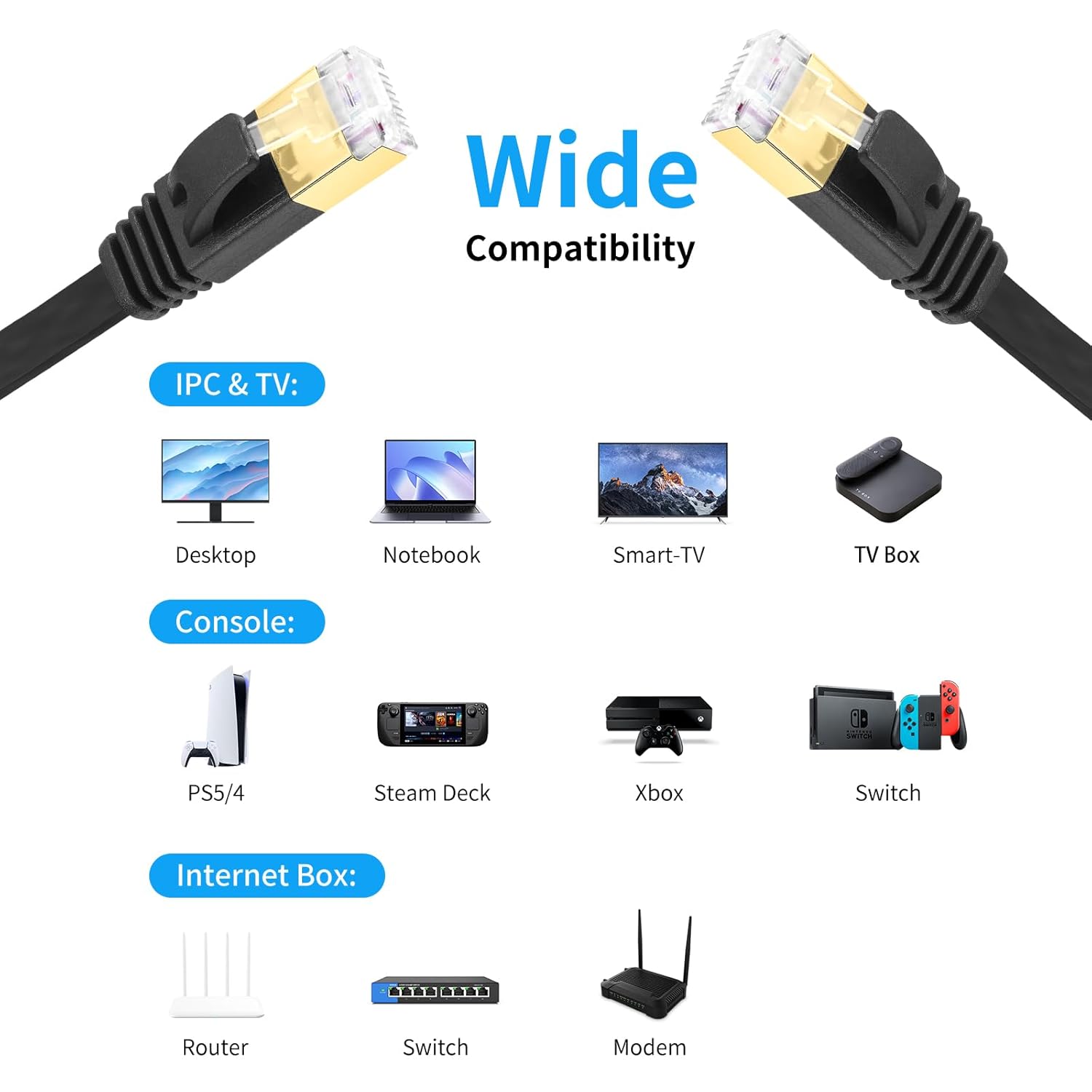 - 【Compatibity】High performance Cat7 ethernet cable, provides universal connectivity for LAN network components, supports all devices with RJ45 Jacks, For PCs, computer cable servers, switch boxes, ADSL, printers, routers, network media players, hubs, television set with network interface, Modems, laptop, tv, USB LAN cable adapter, PS4, also for Xbox One, Gaming, NAS, keystone jack, networking equipment, inline coupler.