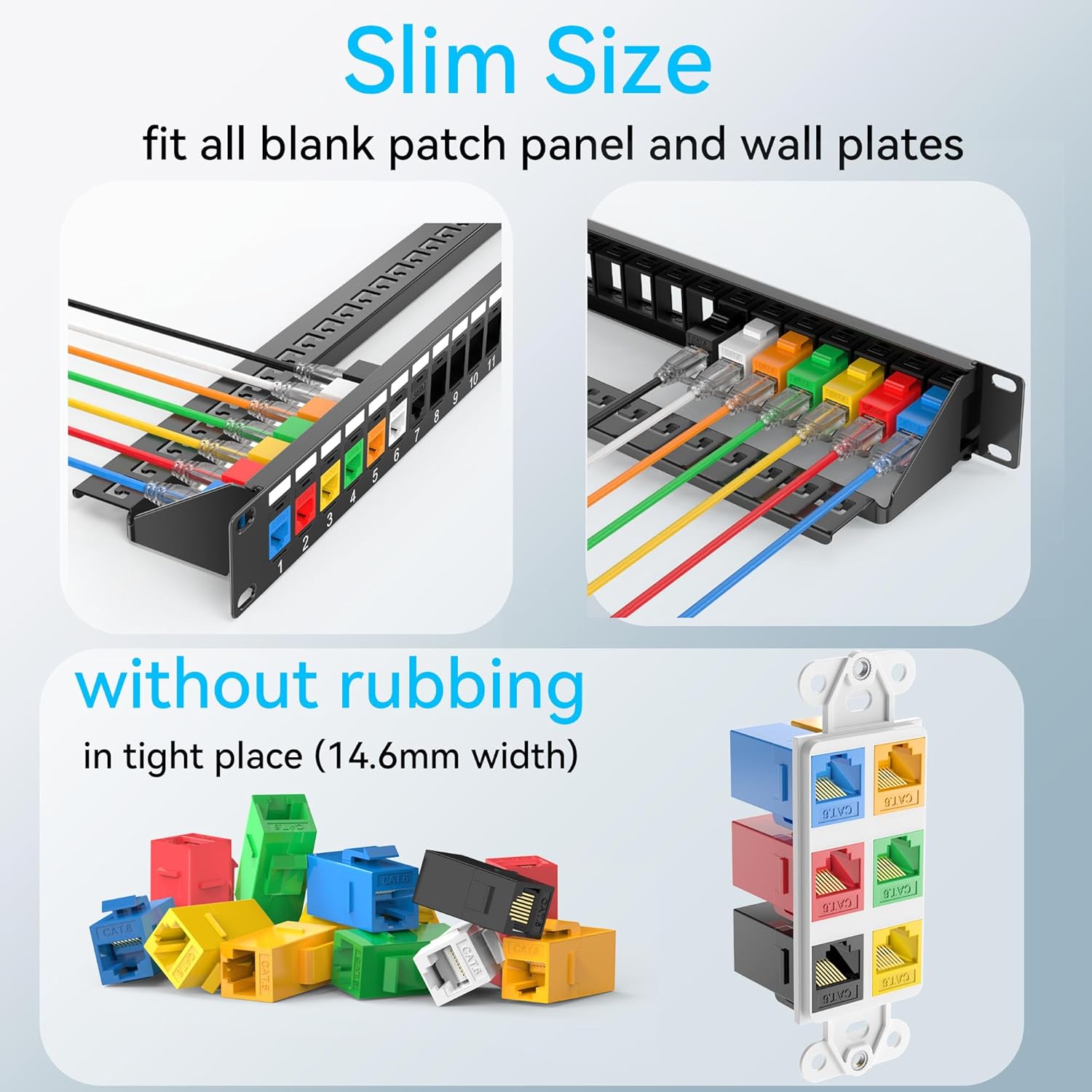 These female-to-female ethernet keystone jacks snap effortlessly into standard keystone wall plates or patch panels. This convenience means less time spent with a punch-down tool and more time enjoying a seamless network DIY setup with neat and professional look.