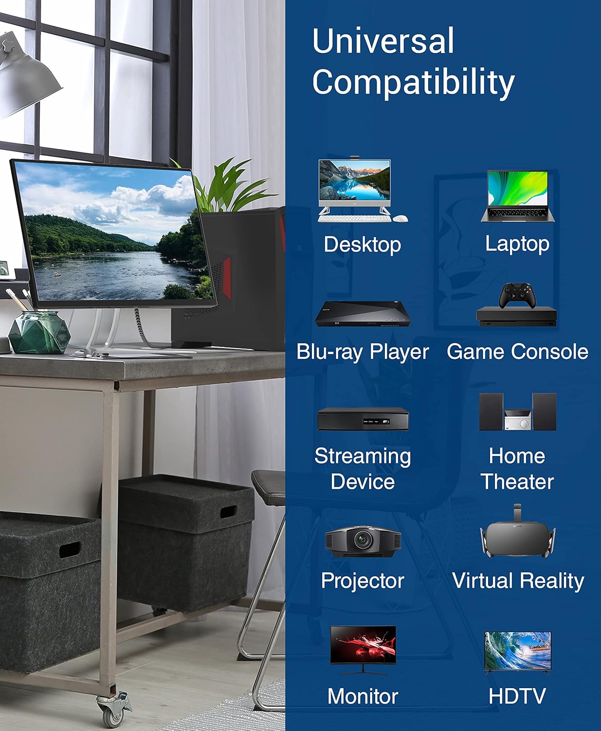- ➤ UNIVERSAL COMPATIBILITY: BlueRigger 8K HDMI Cable is compatible with your streaming devices, DVD/Blu-ray, Fire TV, Roku Ultra, PS5/4/3, Apple TV, NVIDIA shield TV, Xbox Series S/One/360, Switch, PC, or other HDMI-enabled devices to your 4K/HDTV, monitors, displays or projectors
