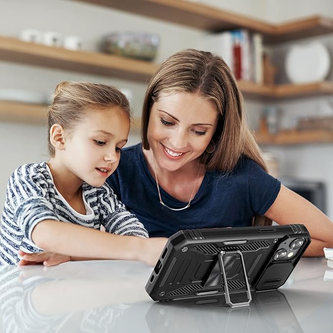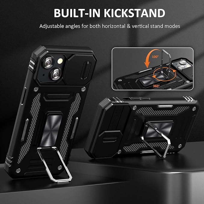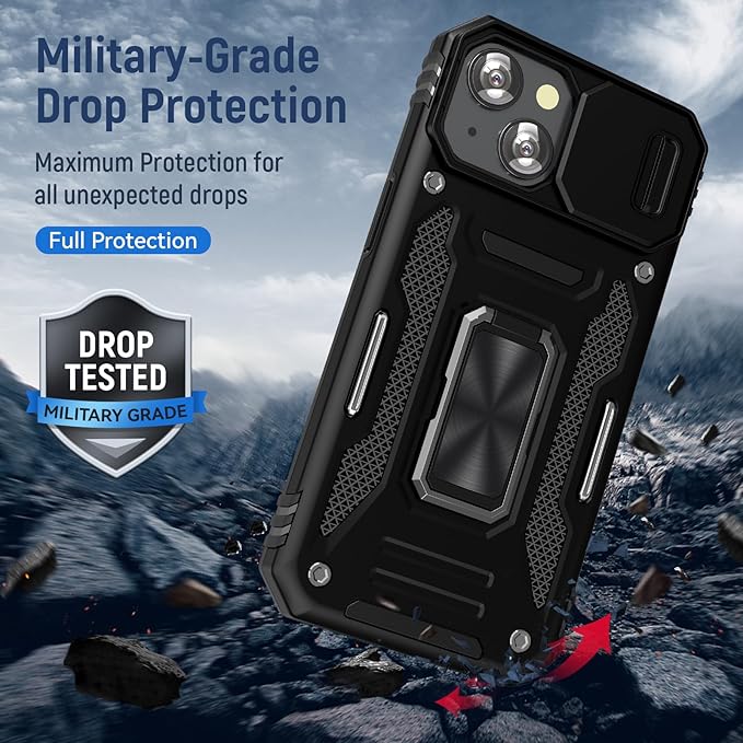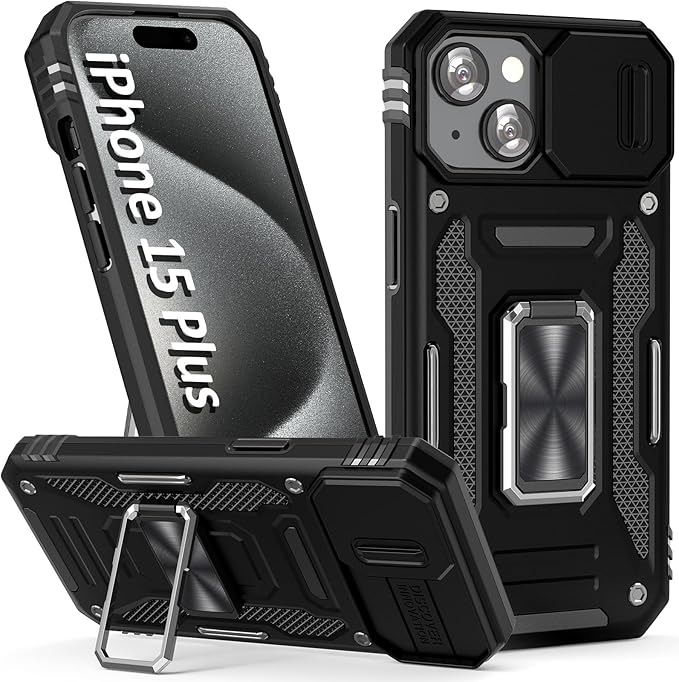iPhone 15 Plus Case with Slide Camera Cover, Ring Holder Stand & Magnetic Car Mount – Black
