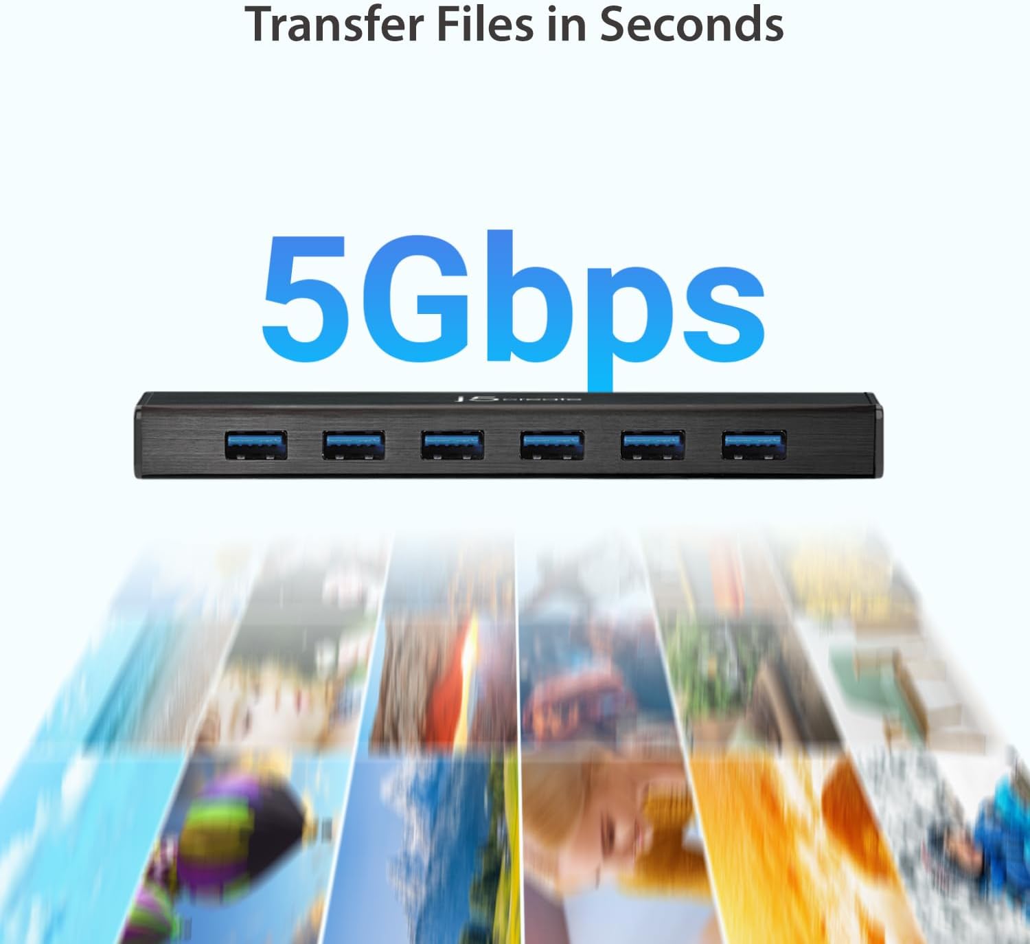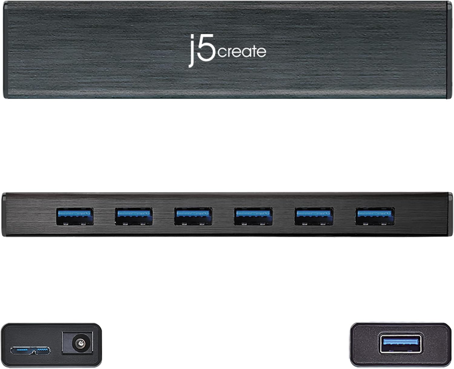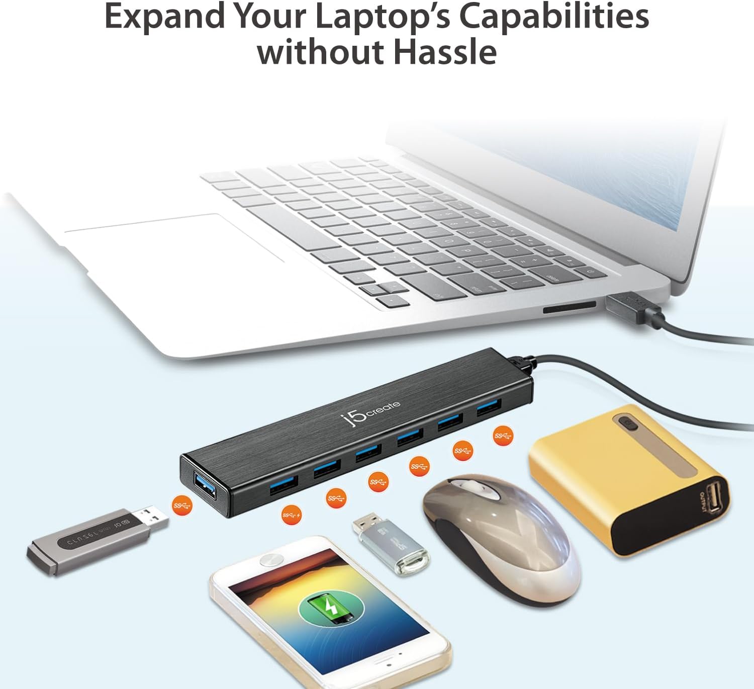 j5create 7-Port Powered USB 3.0 Data Hub with 3.3 ft Extended Cable [20W Power Adapter Included] for Mac, MacBook, Windows, Laptop, Surface, XPS, PC (JUH377)
