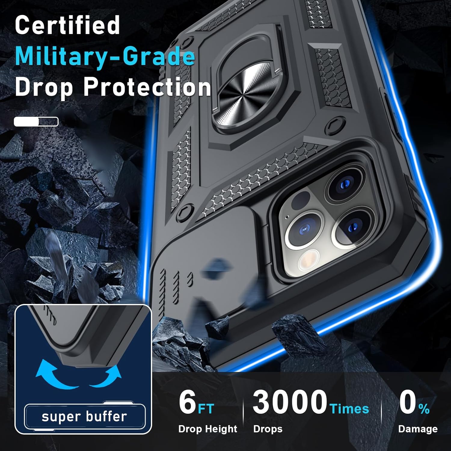 Janmitta Case for iPhone 12 & 12 Pro Phone Cover Built in Slide Camera Lens Cover+Screen Protector,Heavy Duty Shockproof Full Body PhoneCase with Finger Ring Holder Kickstand,Black