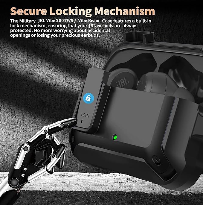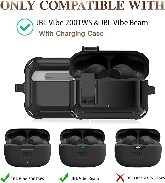 - 👍[Compatible Model] This Armor Series full-body JBL earbuds case cover is designed for JBL Vibe 200TWS & JBL Vibe Beam & JBL Vibe Beam 2 charging case. Please Note: The Vibe Beam and Vibe Beam 2 charging indicator is not visible. This lock case is designed for 2pcs. perfect compatibility with your JBL earbuds.