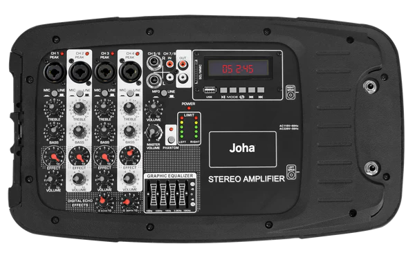 - Complete Control: The JOHA- 2100 Portable PA features an 8- channel powered mixer with an onboard digital echo effect. The unit also houses individual bass and treble effects and volume control for 4 line/ mic inputs to customize your sound completely.