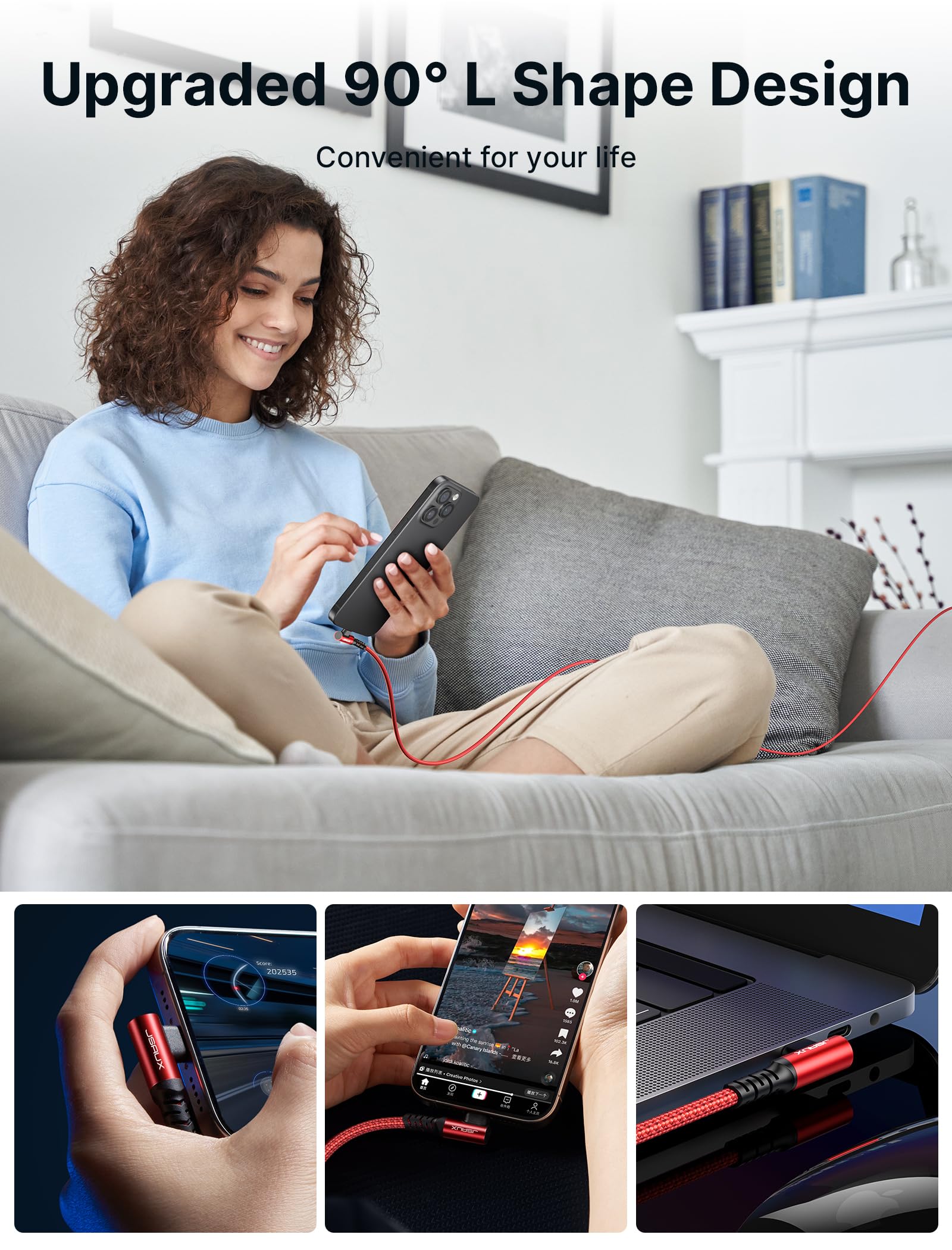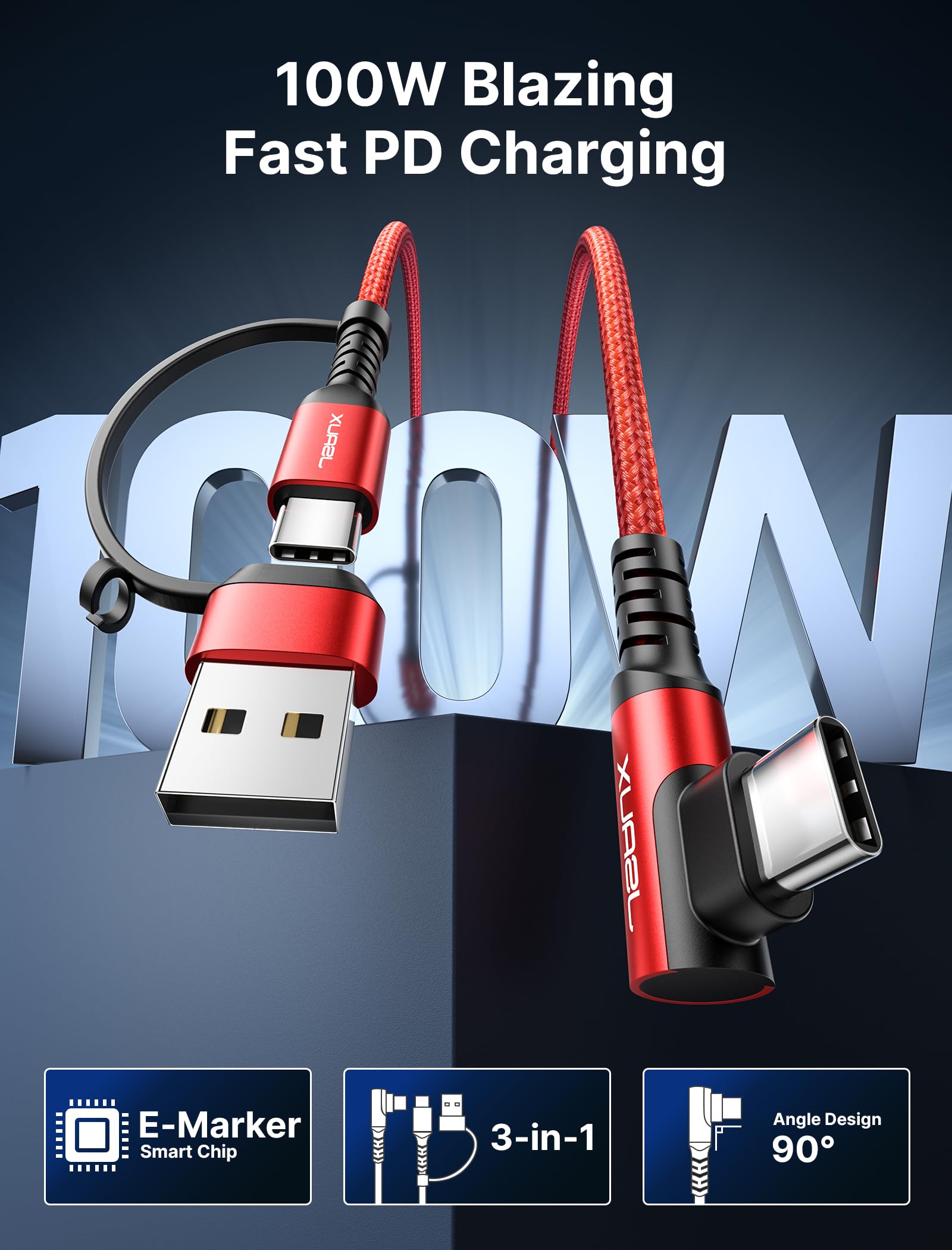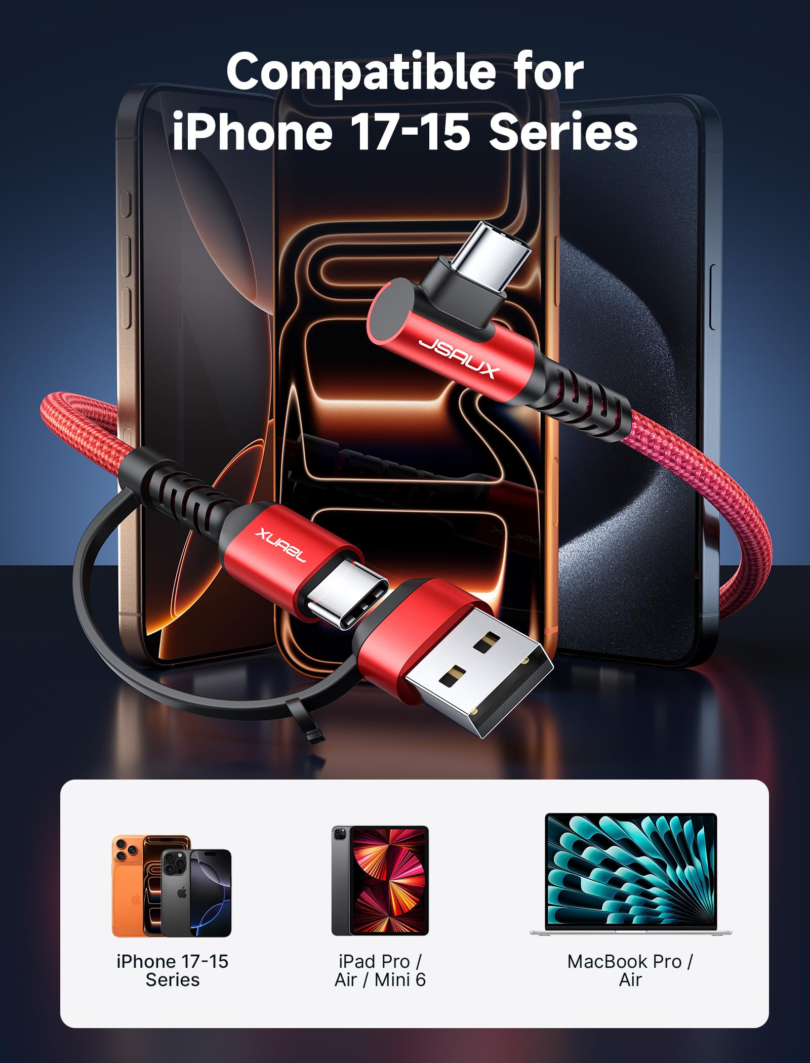 JSAUX 100W USB C Cable [2-Pack 10FT], Right Angle Fast Charging Cord with USB A to C Adapter for iPhone Air/iPhone 17/ iPhone 17 Pro/iPhone 17 Pro Max, iPhone 16/15, Samsung, MacBook, iPad – Red