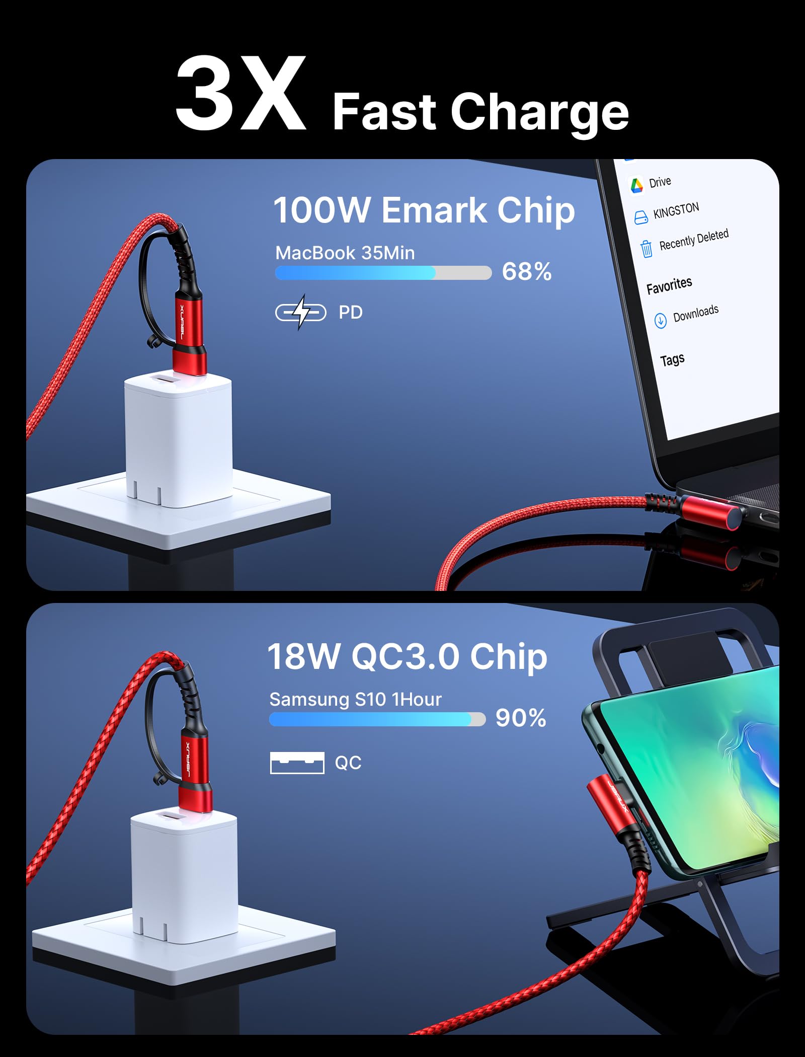 • 3-IN-1 Design: This 100W usb c charger cable has three functions. The first is USB A to USB C fast charging, the second is 100W USB C to USB C fast charging, and the third is a USB A adapter that allows the USB C platform to access the USB A port.