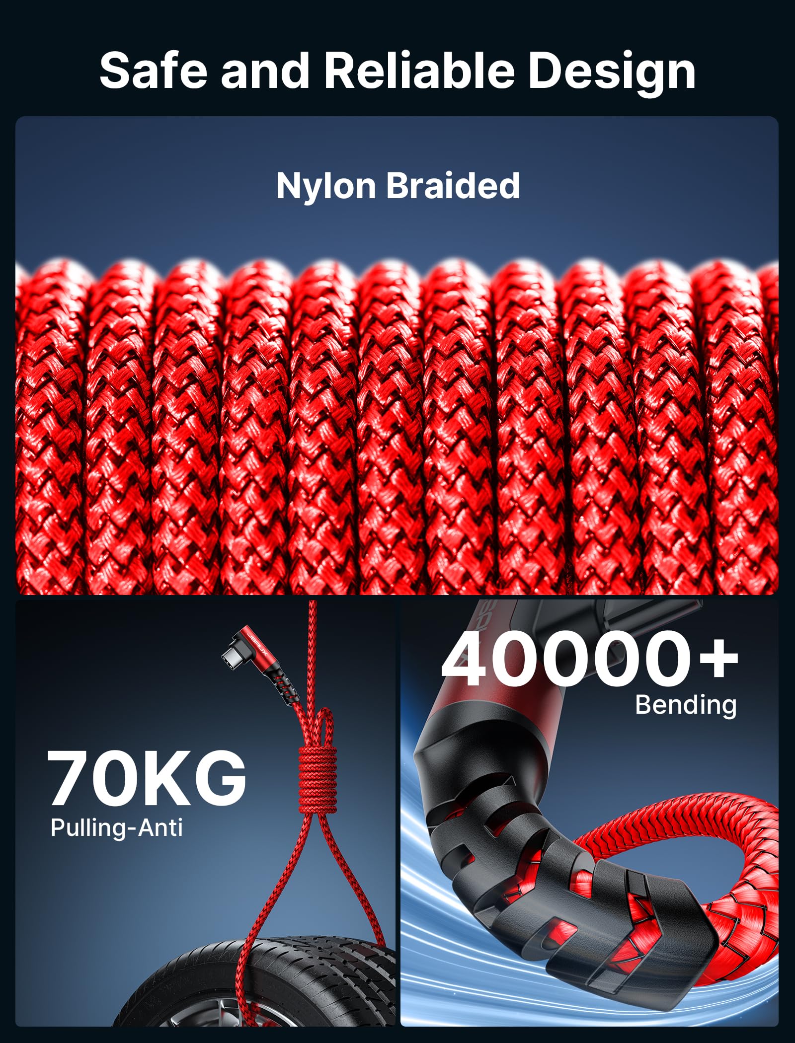 • 90° L Shape Design: The most comfortable grip is provided by the ergonomic 90°, “L” shaped C-type charger, which makes gaming more comfortable, while the super fast charger C-type, it is a magnificent choice for gamers and video enthusiasts. At the same time, it effectively avoids the bending of the end of the cable which leads to breakage and extends the life of the C-type fast charging cable.