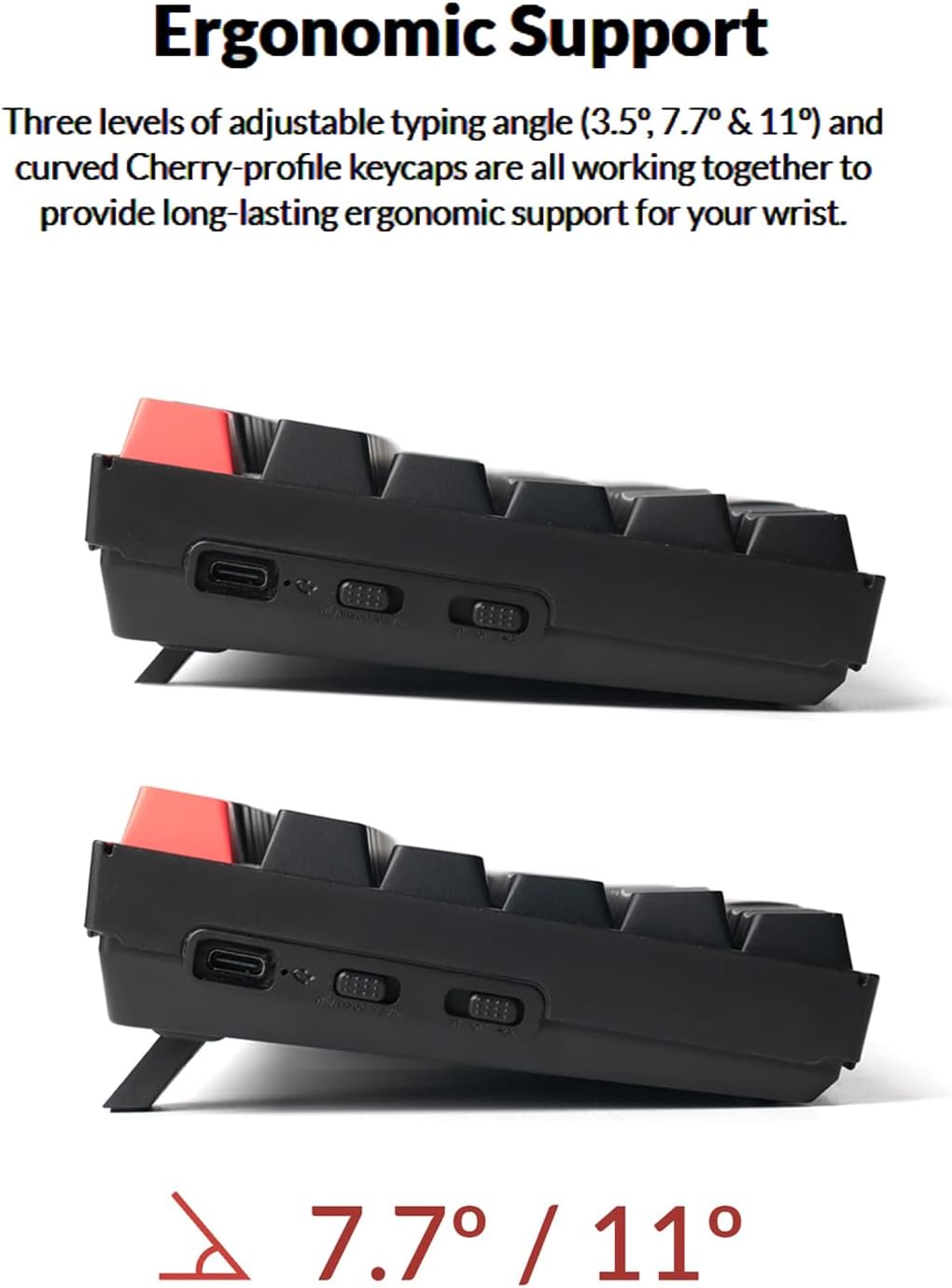 - Upgraded Typing Experience – The K10 version 2 comes with a battery capacity of 4000mAh, is one of the biggest battery in mechanical keyboards. It also has wired mode with USB Type-C connection. Two level adjustable feet and inclined bottom frame provides a great ergonomic support for long lasting typing comfort. The north-facing RGB backlight is designed to better illuminate the keyboard backlight from the typist’s angle.