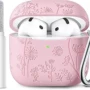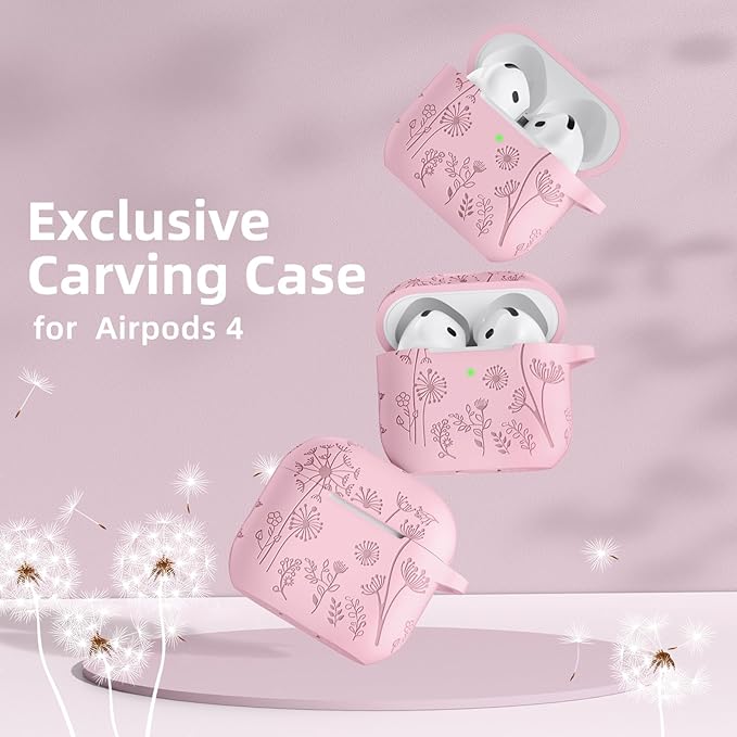 Lerobo for Airpods 4 Case Cover with Cleaner Kit, Cute Flower Engraved Silicone Protective Case Cover with Keychain Compatible with Apple Airpods 4 Case 2024 for Women and Girls, Pink