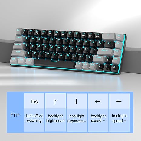 - Classic charming blue LED backlit: Customize multiple illuminated LED light effects, supports about 16 backlight modes, press Fn + Ins can control it, FN + ←/→ control backlight speed, FN + ↑/↓ control backlight brightness.