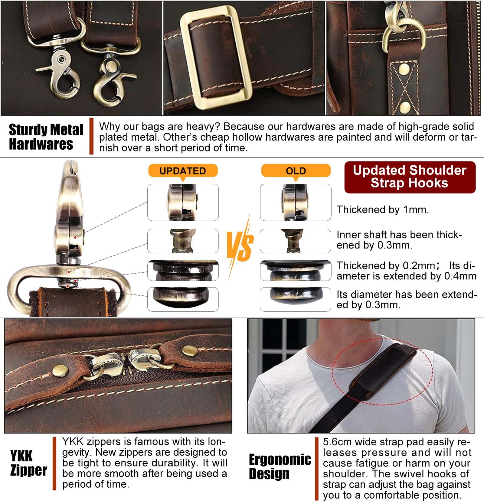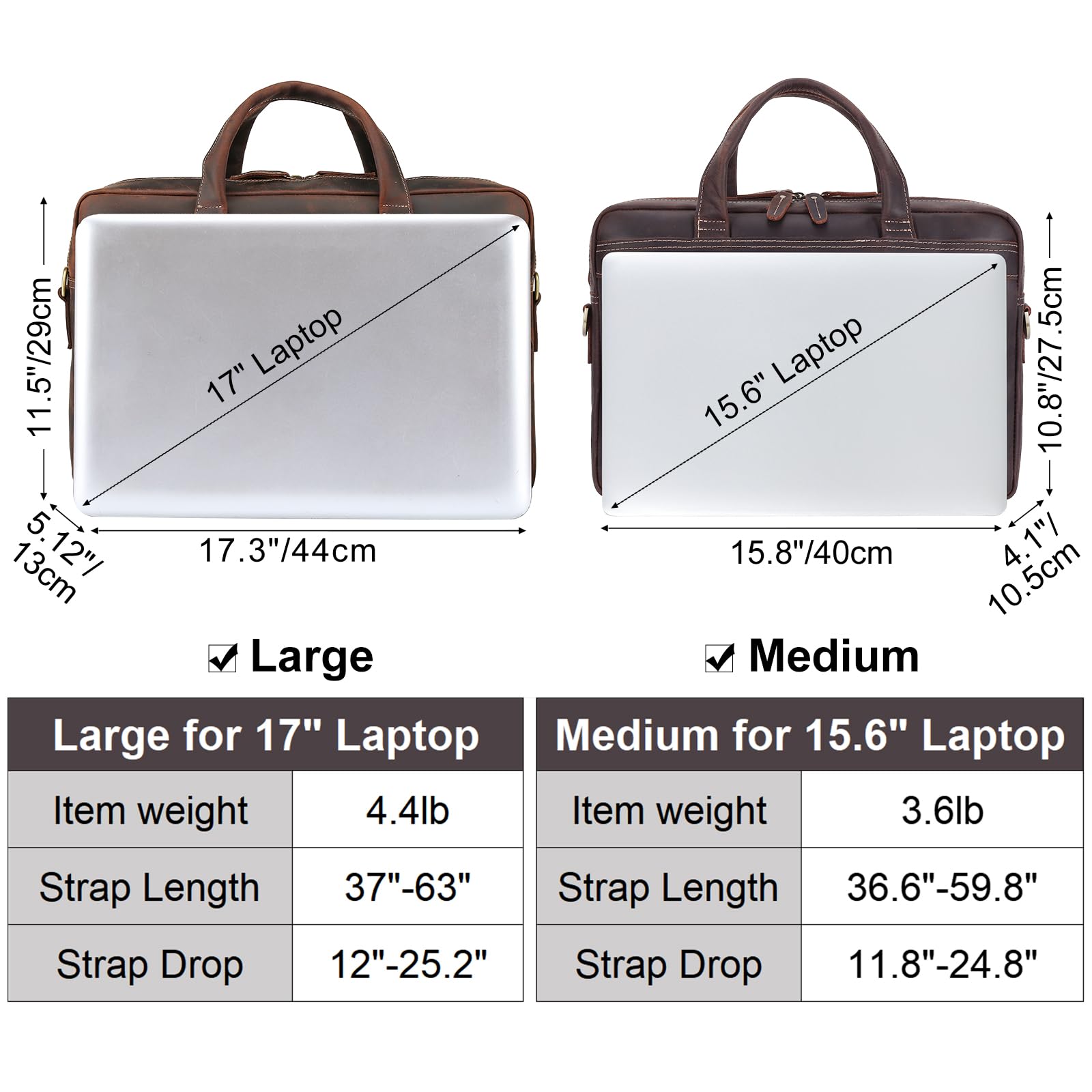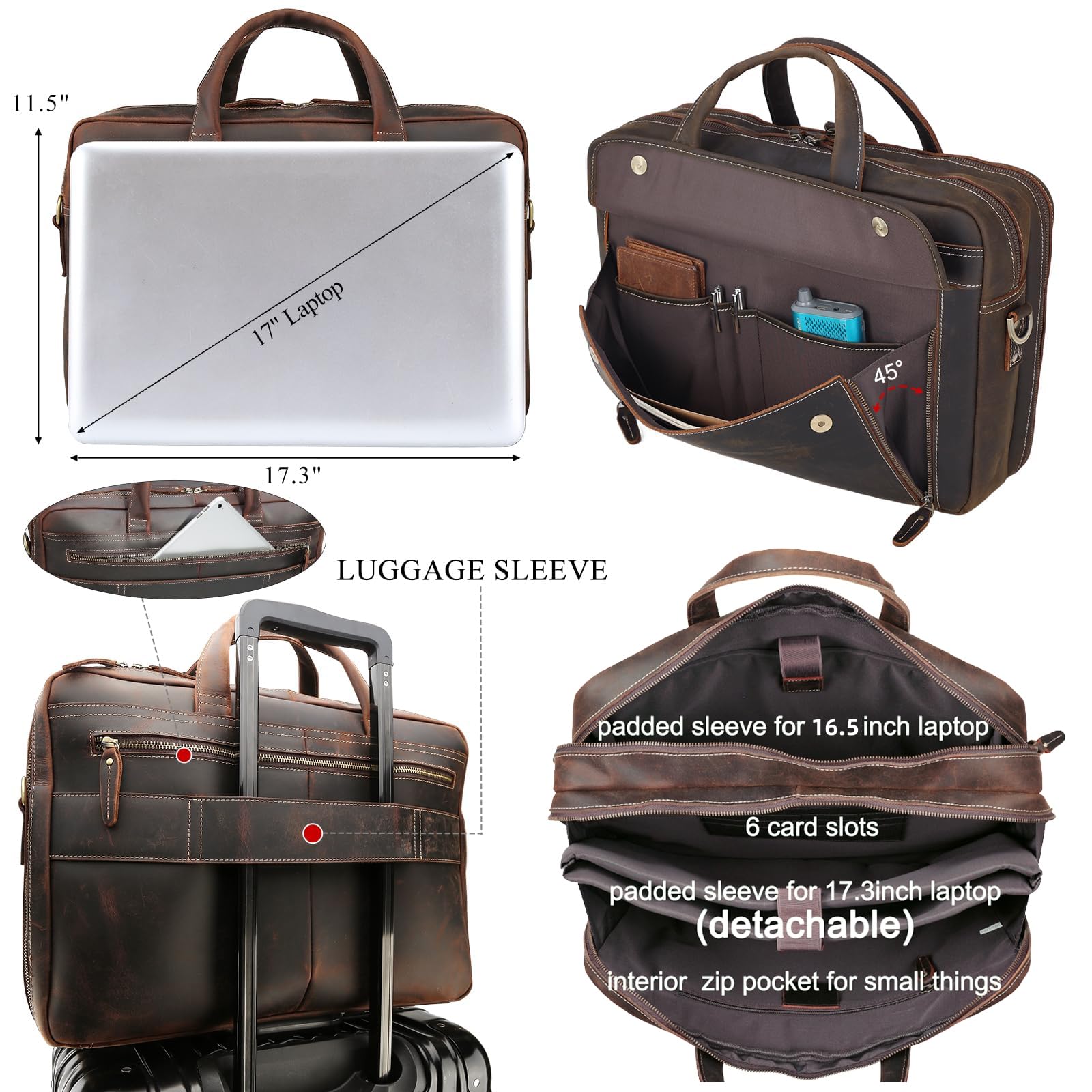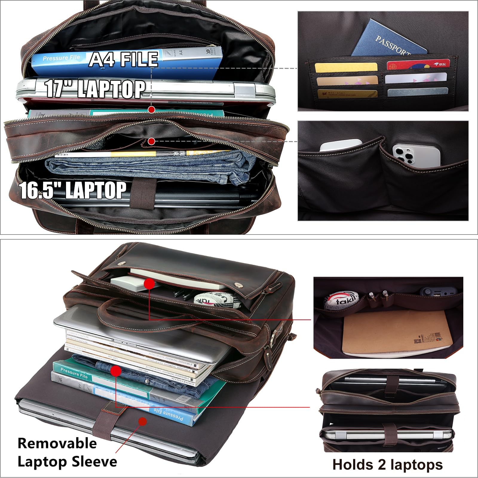 - 【Special Feature】The leather laptop briefcase can hold 2 computers at the same time. 1 removable sleeve for 17.3″ laptop and 1 fasten sleeve for 16.5″ to 17” laptop. The laptop bag has been updated to ykk metal zippers, which can bear 1000 times pull strength testing, to ensure quality and reliability. Shoulder straps hooks are upgraded to ensure durability.