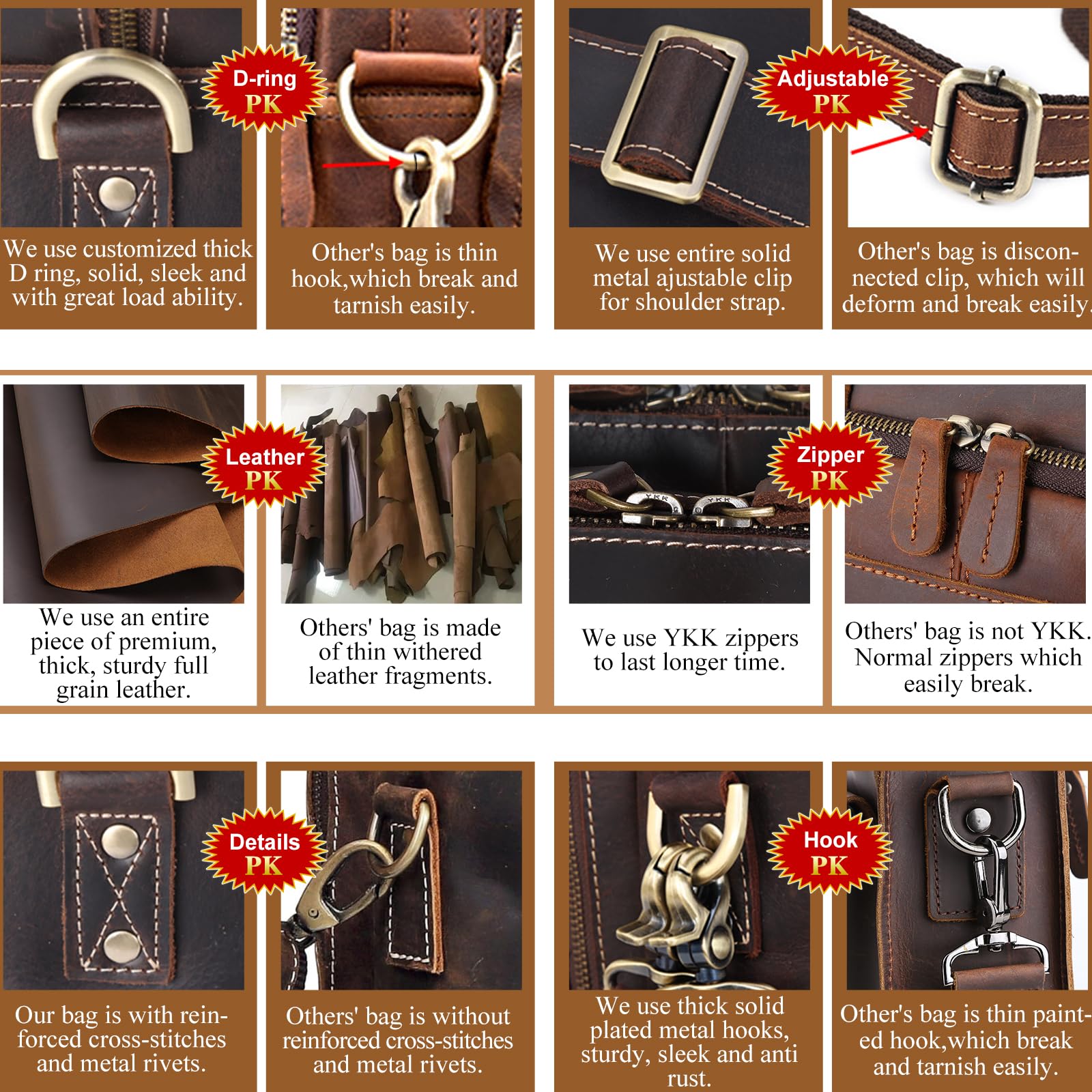 - 【Quality Material】 Made of 2mm thick full grain cowhide leather processed with crazy horse leather technology, this messenger bag is featured with outstanding durability and weathered vintage look. The leather grows brighter and shiny with age. That’s why many people become followers of crazy horse leather bag. Delicate stitching and heavy duty hardware ensures its long use time