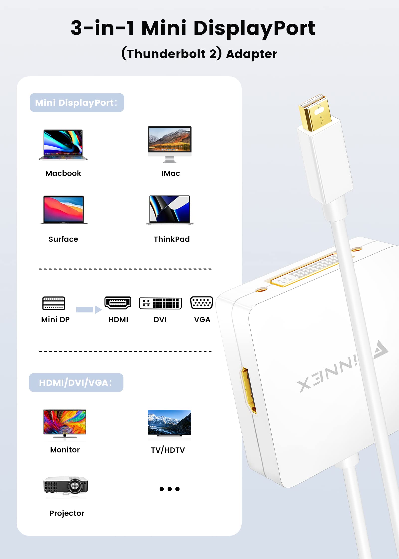 - 【Compatible Device】Compatible with Apple Mac Mini, MacBook Pro, MacBook Air, Microsoft Surface Pro 6 5 4 3, Surface Book, ThinkPad X1 and other devices with a mini DP or Thunderbolt 2 port.(Note:Due to the devices’ updating,please confirm the I/O interface type before purchasing.)