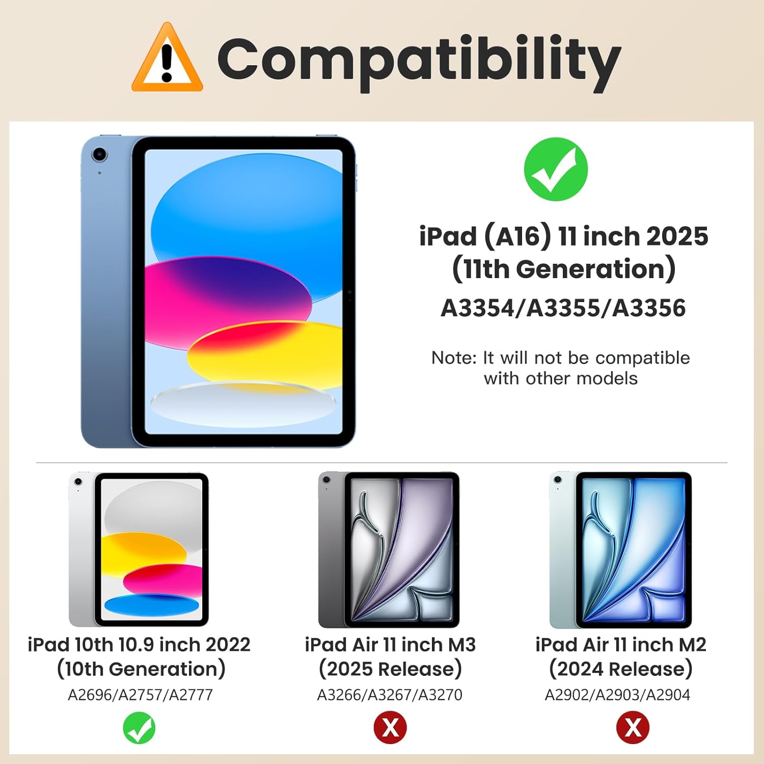 - Compatibility: ONLY Specially designed for iPad (A16) 11th generation 11-inch 2025 (Model: A3354, A3355, A3356), iPad 10th generation 10.9-inch 2022 (Model: A2696, A2757, A2777). Note: This case is not compatible with any other devices. Please verify your iPad’s model number located on the back of the device before purchasing
