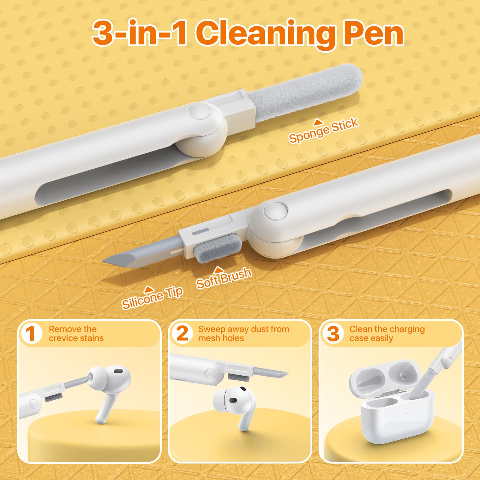 - Multifunctional Cleaning Pen: The included dual-head cleaning pen is an excellent helper for cleaning your AirPods Pro 3. The silicone tip can remove dirt from gaps and holes, while the soft brush makes cleaning the sound holes of your AirPods Pro easy and convenient. The high-density sponge stick on the other end gently wipes away dust inside the charging case