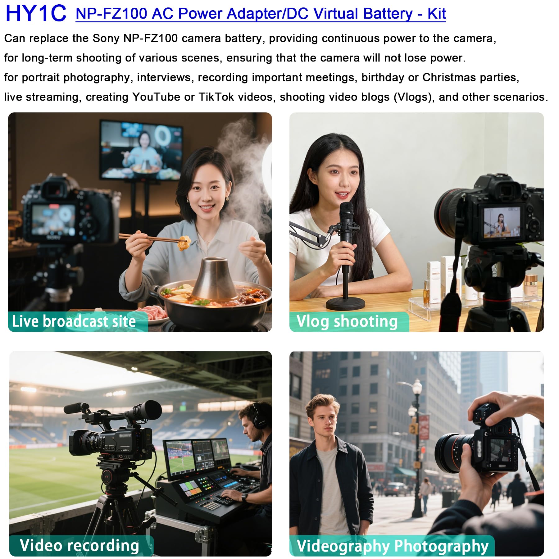 • ◆ HY1C NP-FZ100 AC power adapter to NP-FZ100 DC dummy battery – kit, Replace the Sony NP-FZ100 BC-QZ1 battery, for Sony camera charging, No other accessories required, just connect and use, very suitable for long time use camera shooting, live,network conference, Vlog videos