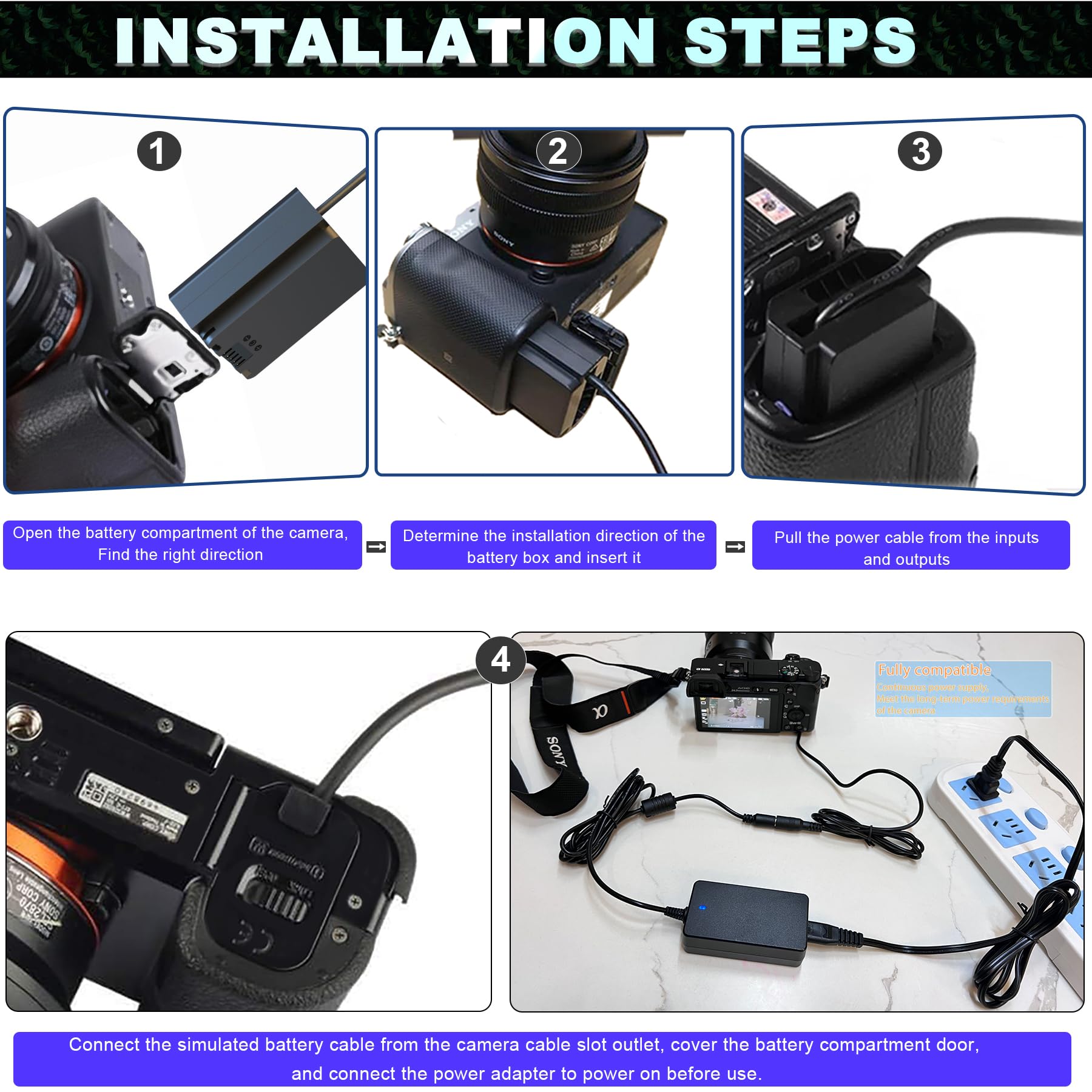 INSTALLATION STEPS: 1.Open the battery compartment of the camera Find the right dire → 2.Install in the correct direction dummy battery → 3.Insert the battery cord through theslot groove of the camera battery compartment → 4.Put on the battery cover and connect to the power adapter.
