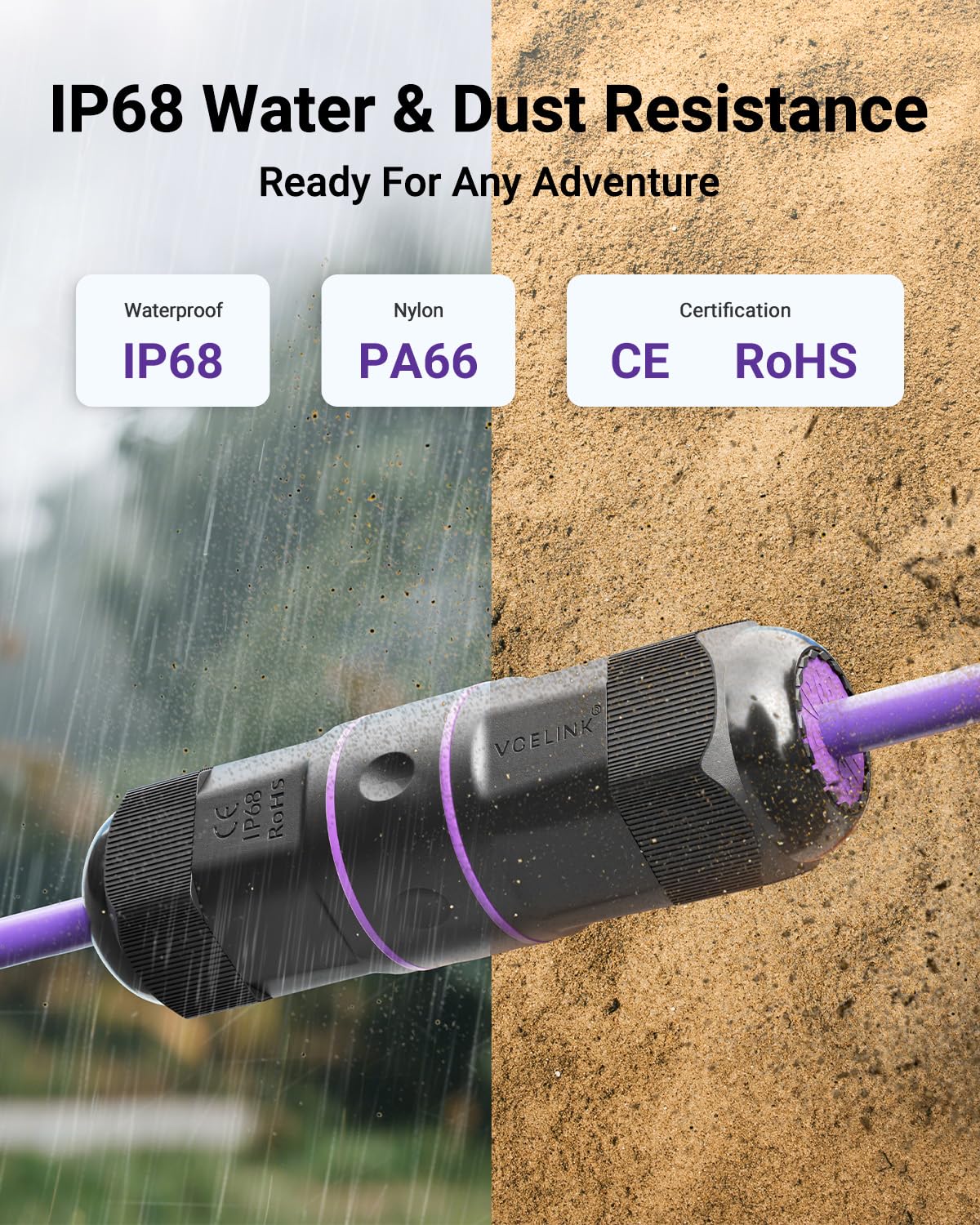 - IP68-lEVEL PROTECTION – VCELINK waterproof ethernet coupler provides professional protection for your RJ45 ends from the outside elements (dust, rain, corrosion, etc.) The “8” for IP68 means it can be immersed in water 1.5 meters or deeper for at least 30 minutes.