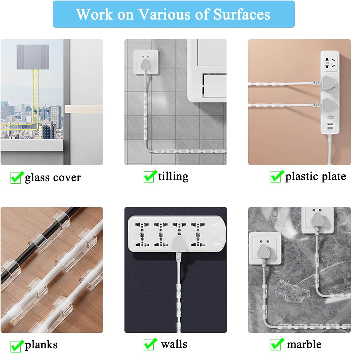 - Easy installation: Clear cable clips mini only needs to remove the paper and stick adhesive, without drilling holes or requiring additional tools. Easy to install on different surfaces, such as tables, walls, plastics, wood, glass, metal, etc