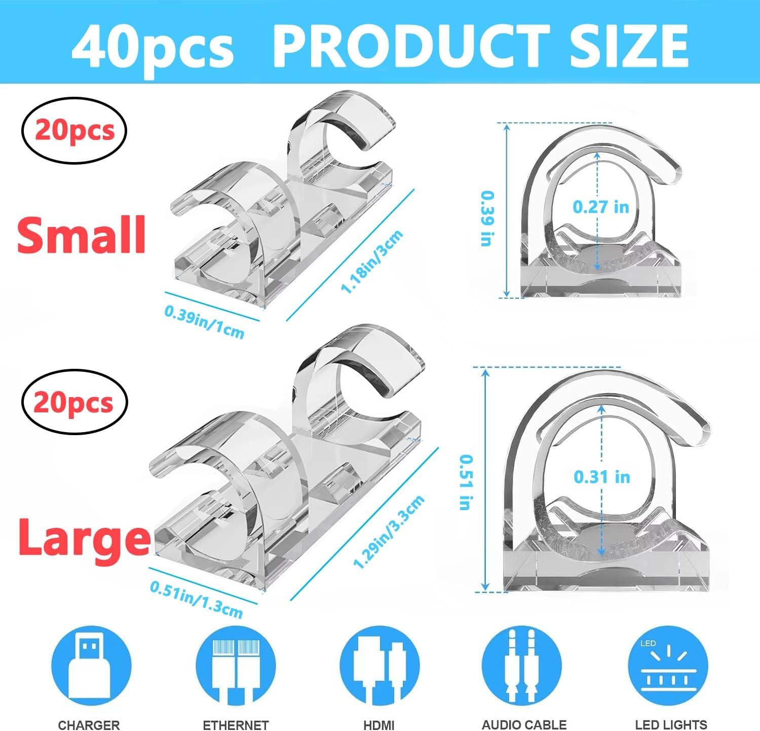 - Size: Finisher wire clamp self adhesive includes 20 small and 20 large . The small size is 3 * 1 * 1cm, while the large size is 3.3 * 1.3 * 1.3cm, which can meet the needs of different wires and is more convenient and easy to organize.